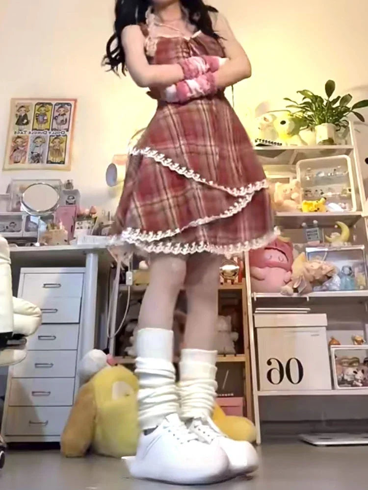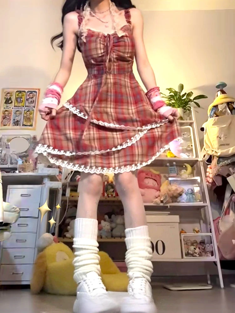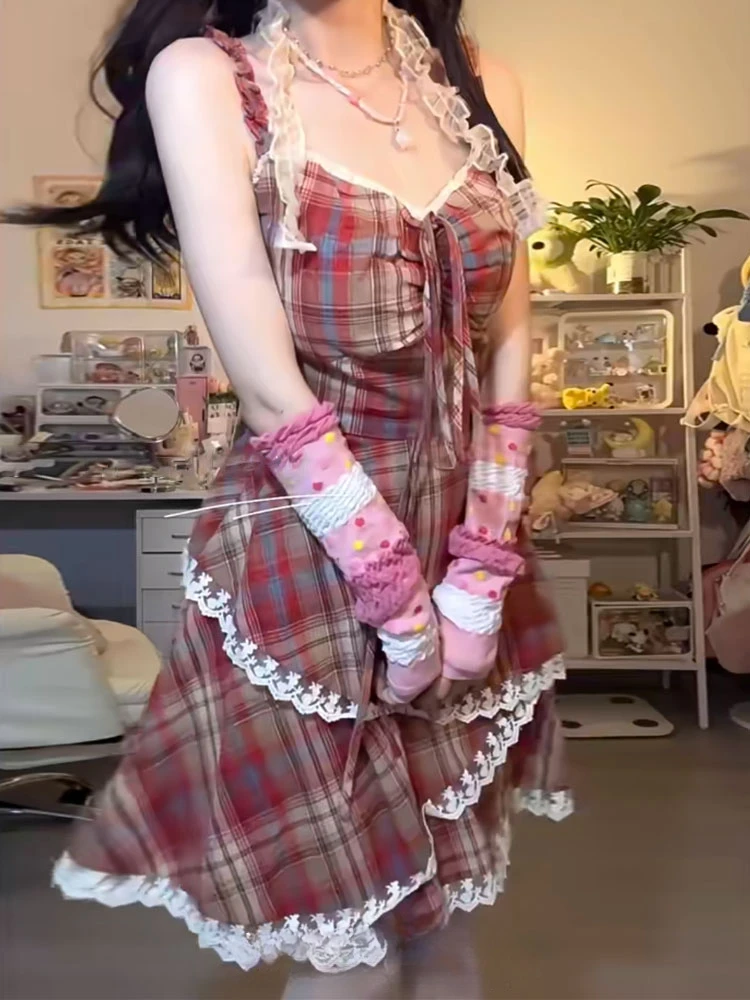 DAIIIBABYYY - Sweet Cool Hottie Style Plaid Irregular Lace Spliced Camis Dresses Women's Summer Off-shoulder Waist Slimming Sling Cake Dress