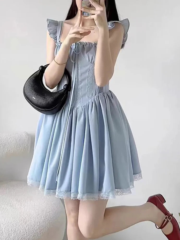 DAIIIBABYYY - Sweet French Blue Dress Women Elegant Lace Patchwork Retro Sexy Mini Dress Casual Square Collar Flying Sleeve Vestidos New