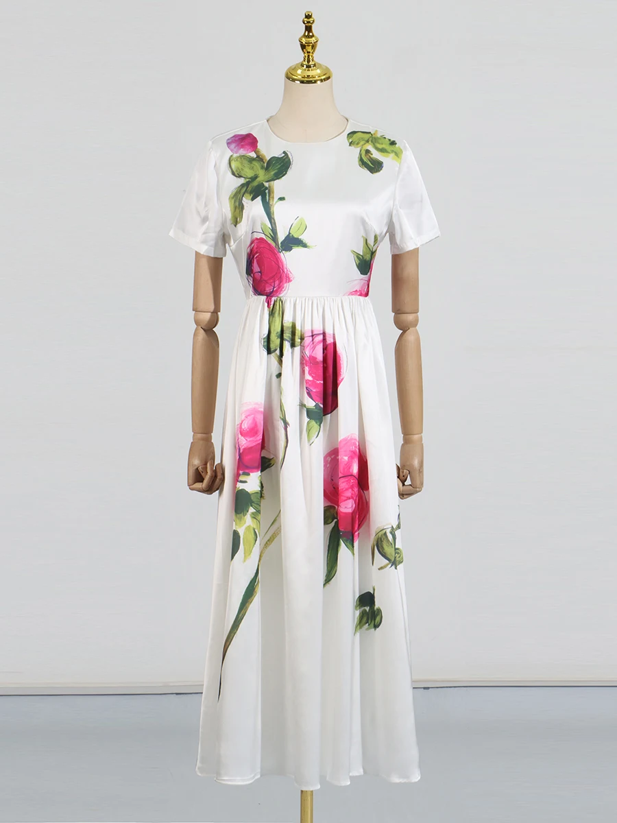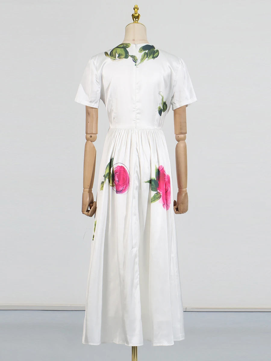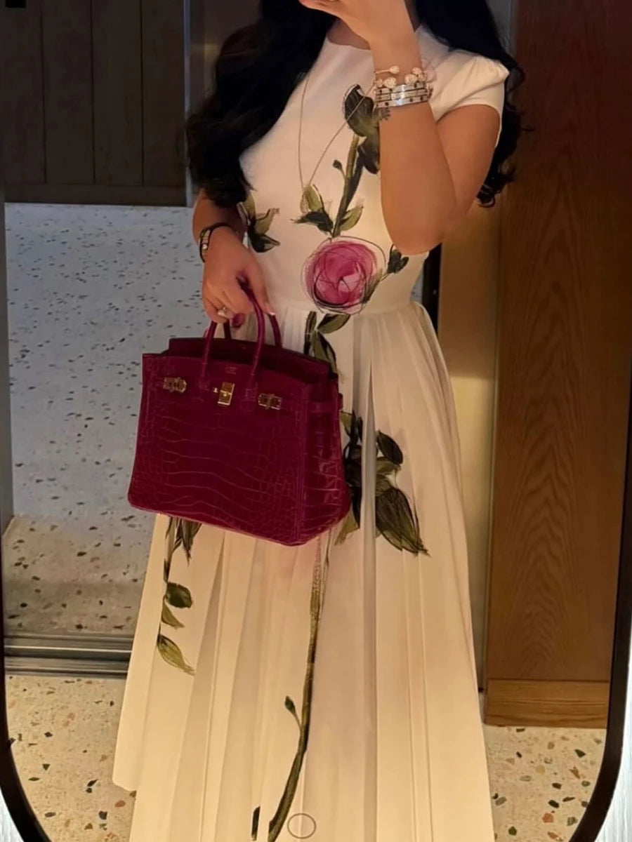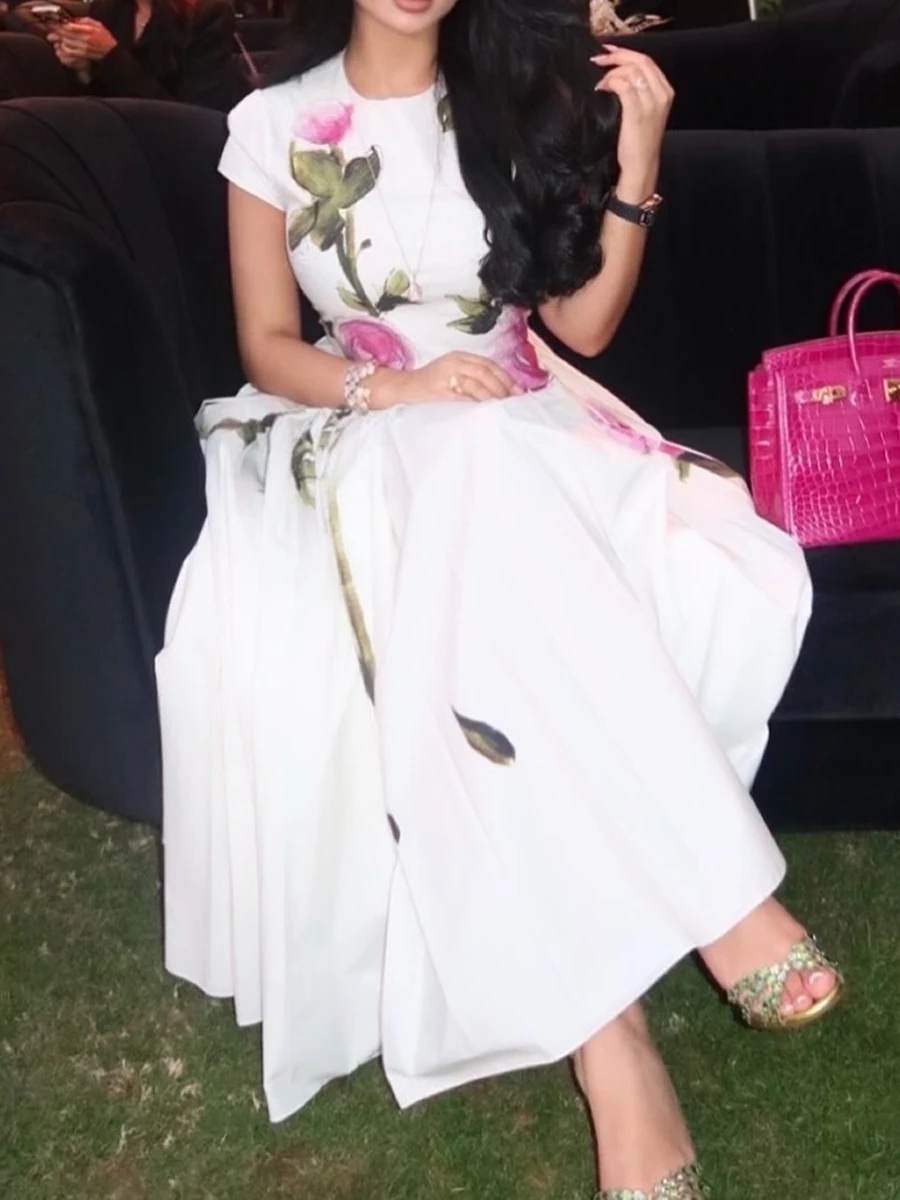 DAIIIBABYYY - Temperament Printing Long Dresses For Women Round Neck Short Sleeve High Waist Folds Elegant Spring Dress Female Fashion