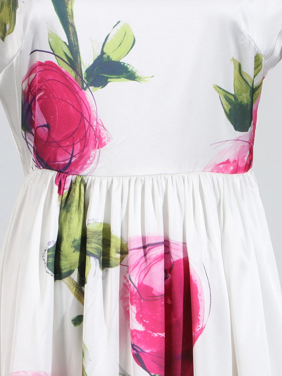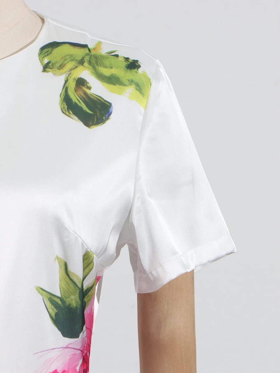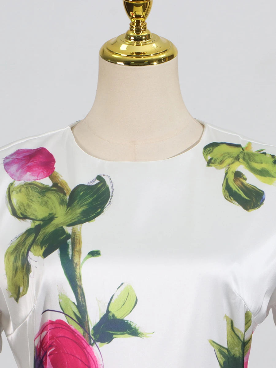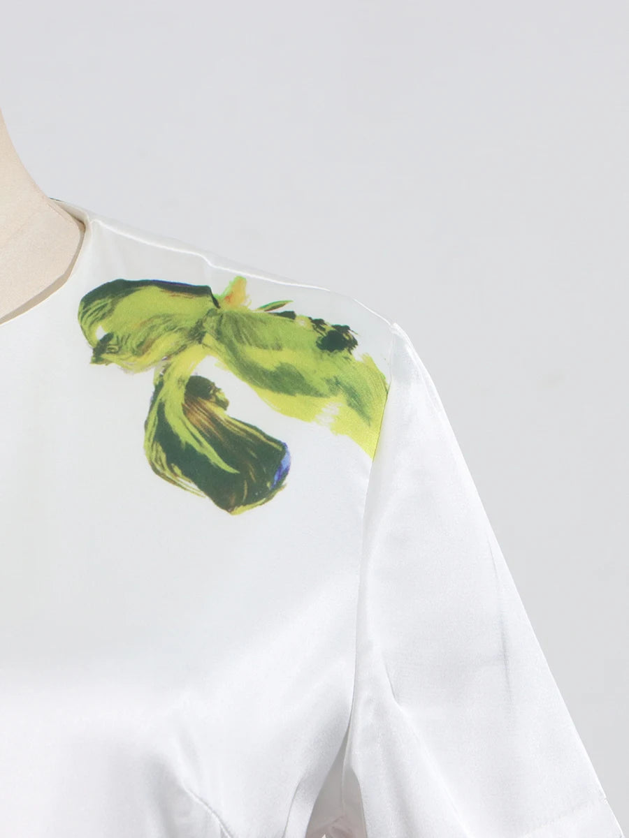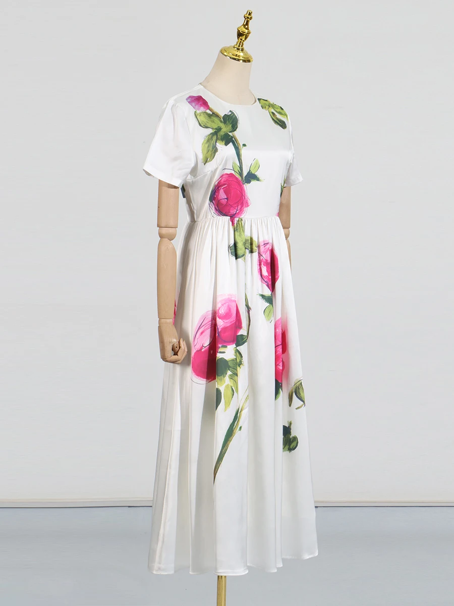 DAIIIBABYYY - Temperament Printing Long Dresses For Women Round Neck Short Sleeve High Waist Folds Elegant Spring Dress Female Fashion