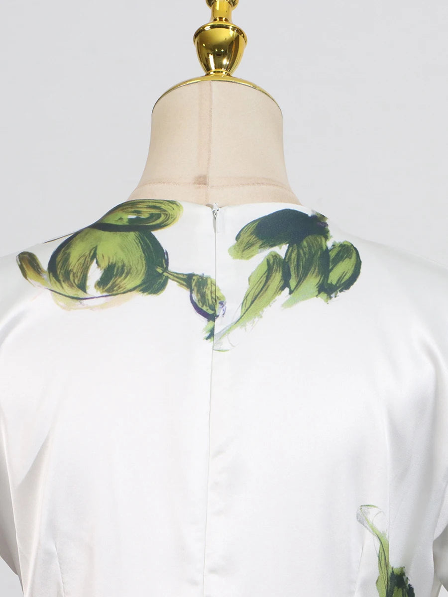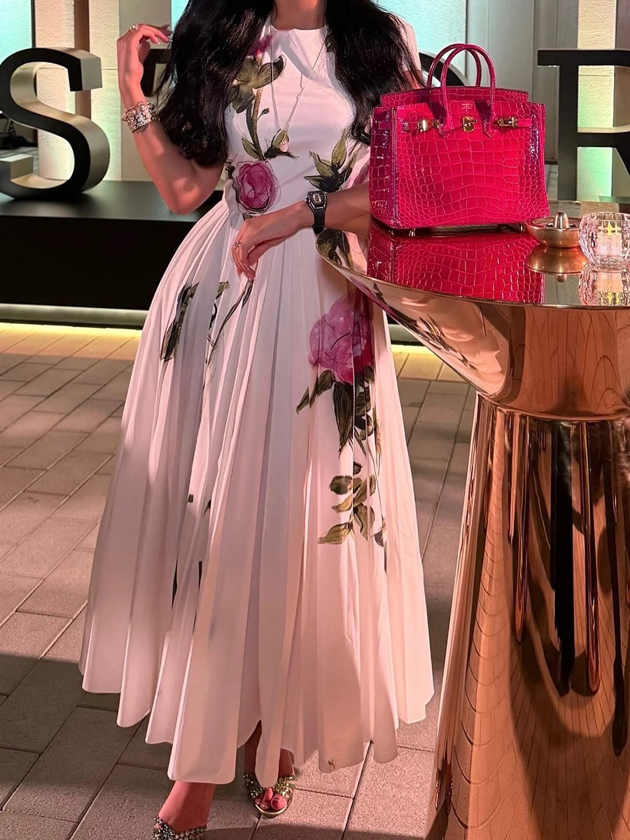 DAIIIBABYYY  -  Temperament Printing Long Dresses For Women Round Neck Short Sleeve High Waist Folds Elegant Spring Dress Female Fashion