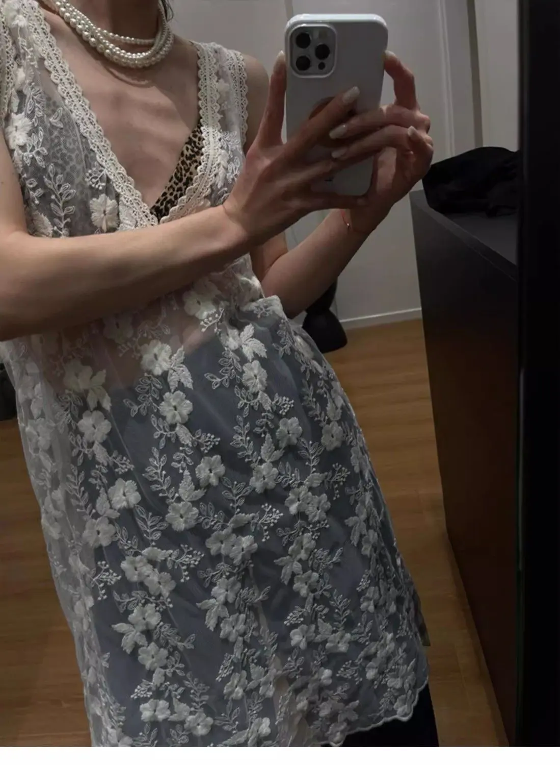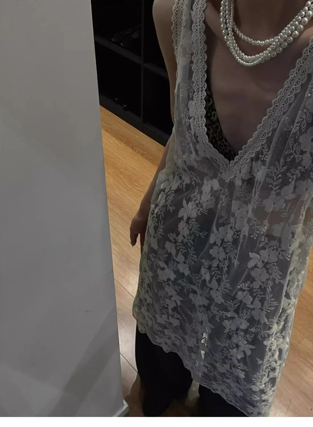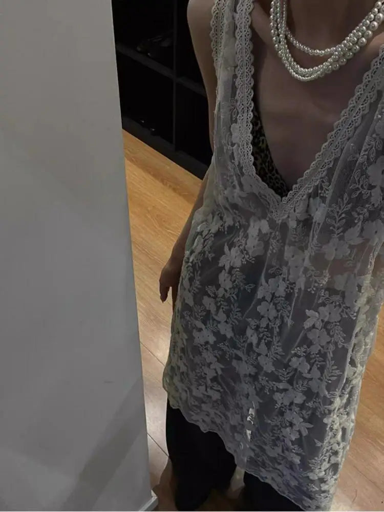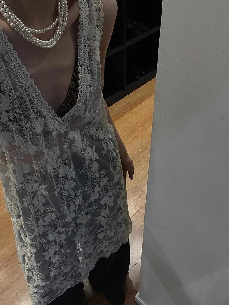 DAIIIBABYYY - V-neck Lace See Through Summer Dress Women Sleeveless Beach Style Korean Fashion Tank Tops Ladies Dresses Loose Chic Y2k