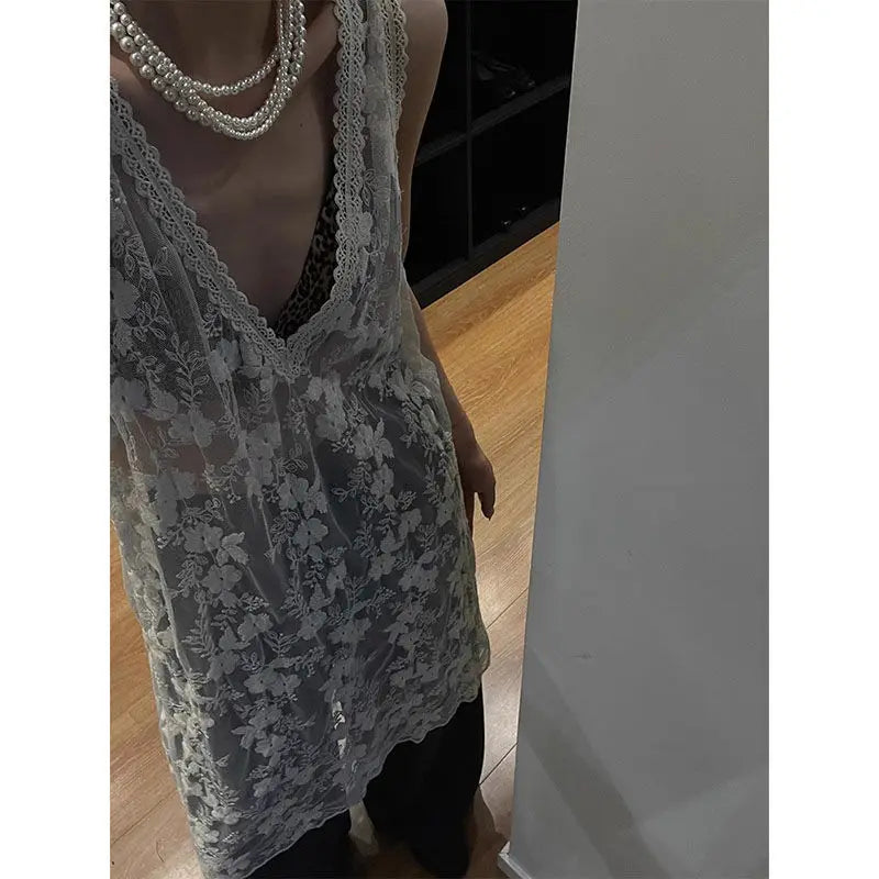 DAIIIBABYYY  -  V-neck Lace See Through Summer Dress Women Sleeveless Beach Style Korean Fashion Tank Tops Ladies Dresses Loose Chic Y2k