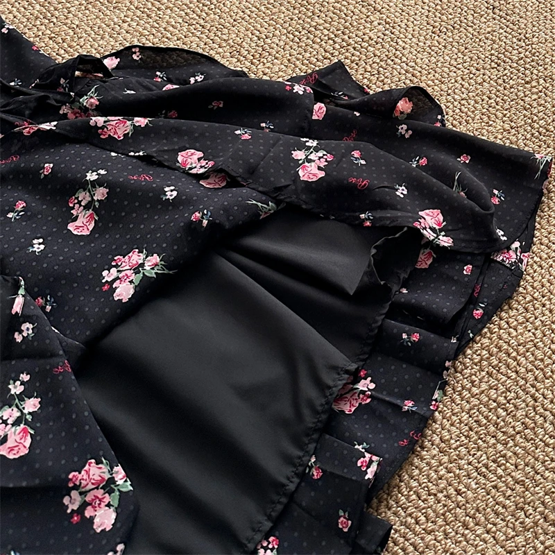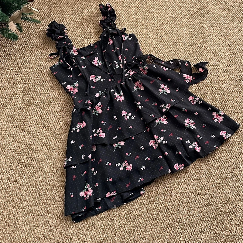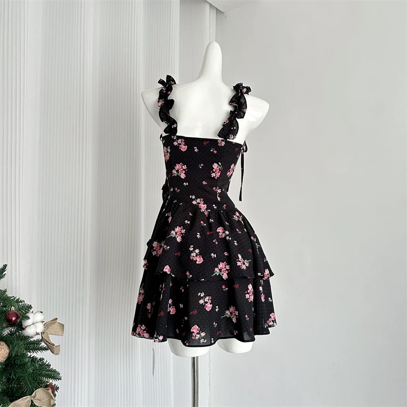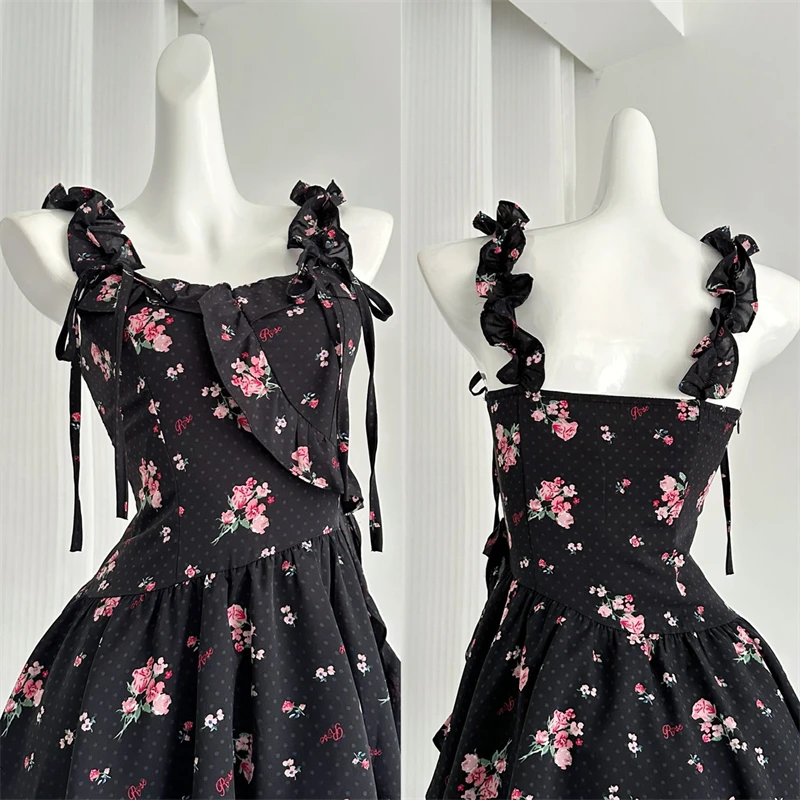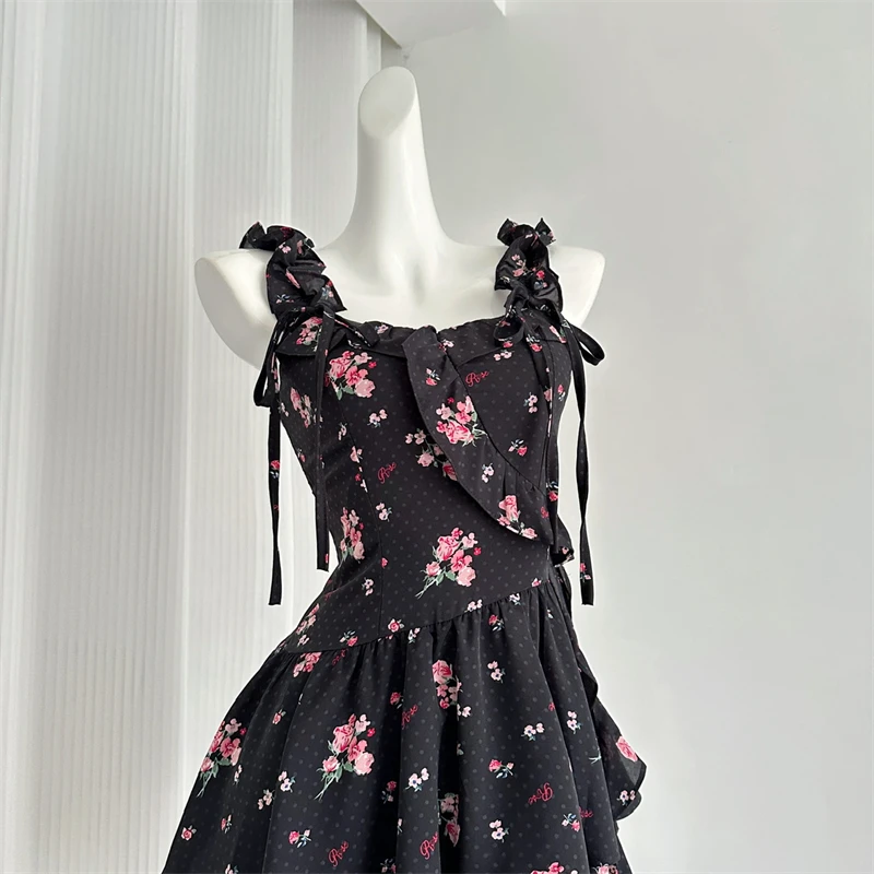 Daiiibabyyy Women Black Gothic A-line Dress Vintage Elegant Sleeveless Off Shoulder Flower Dresses Y2k One Piece Frocks Summer Clothes 2024
