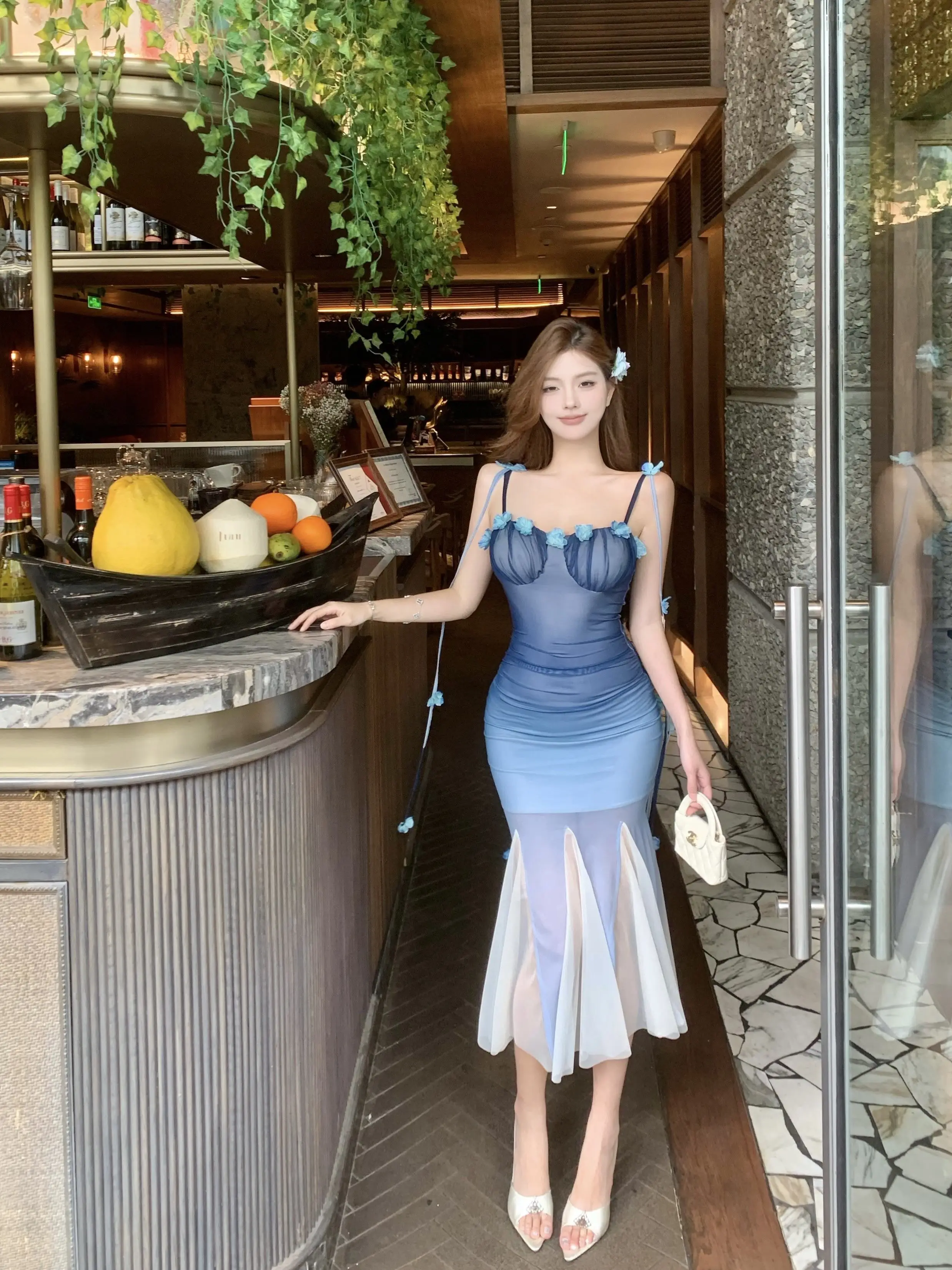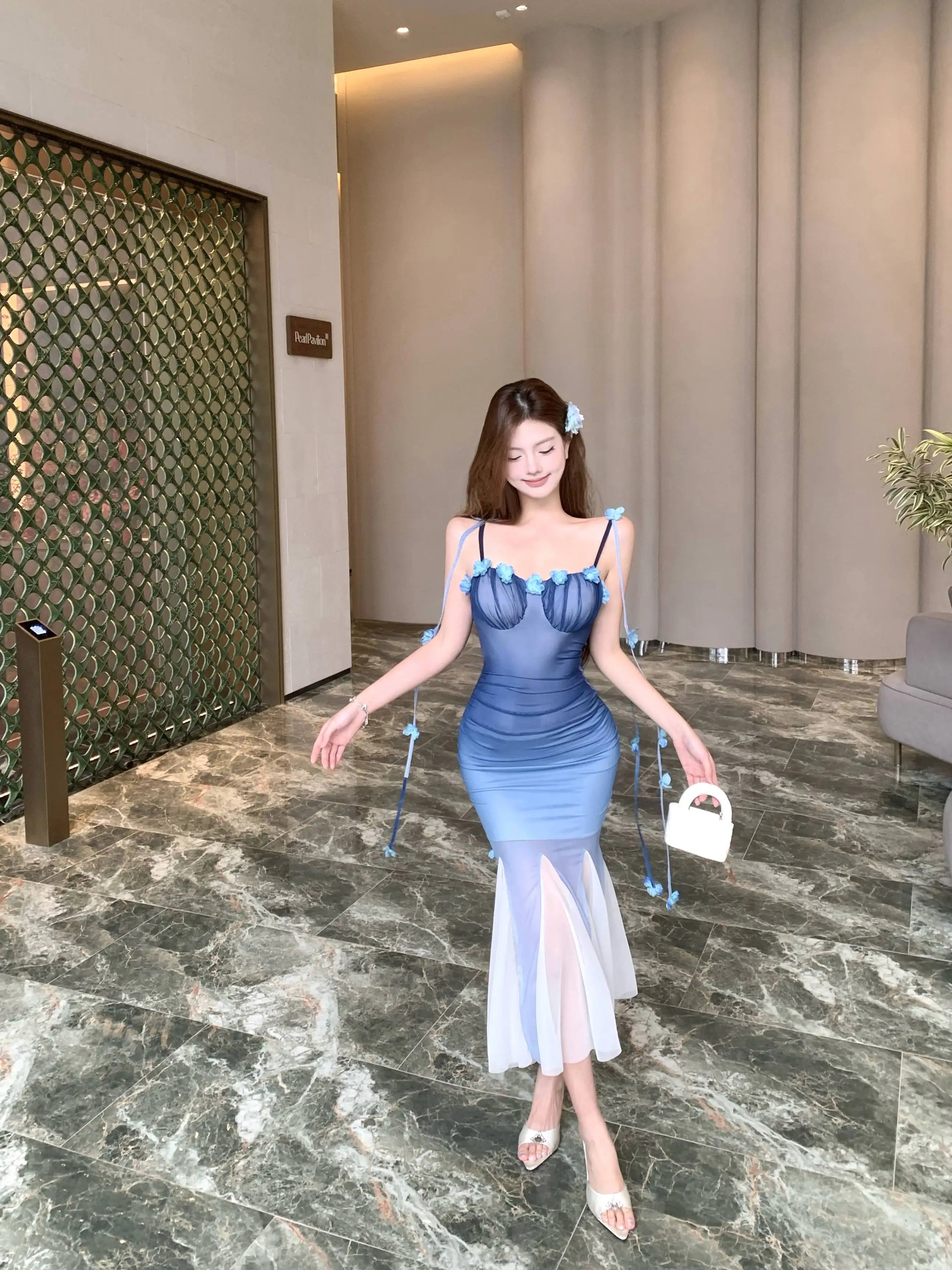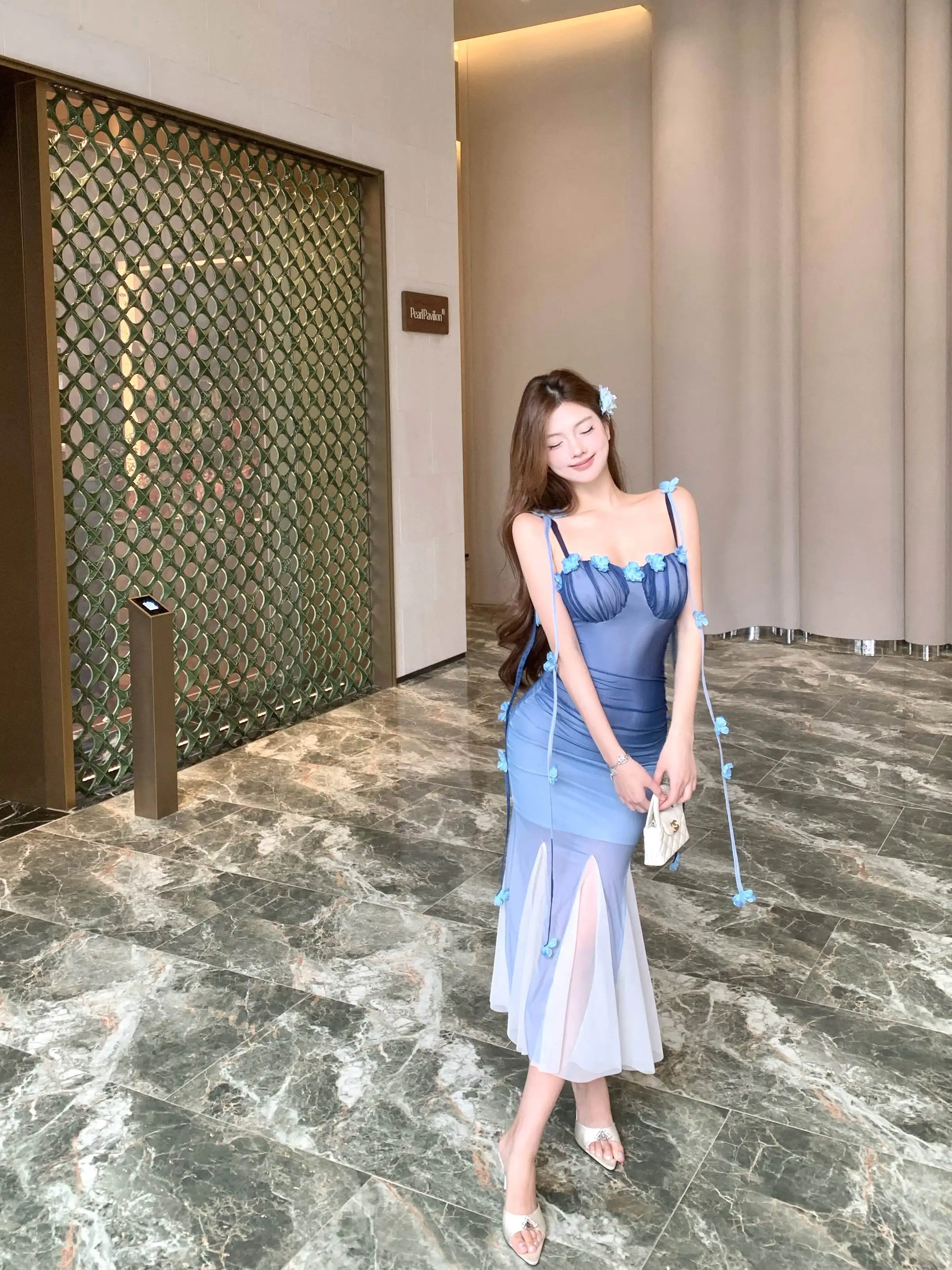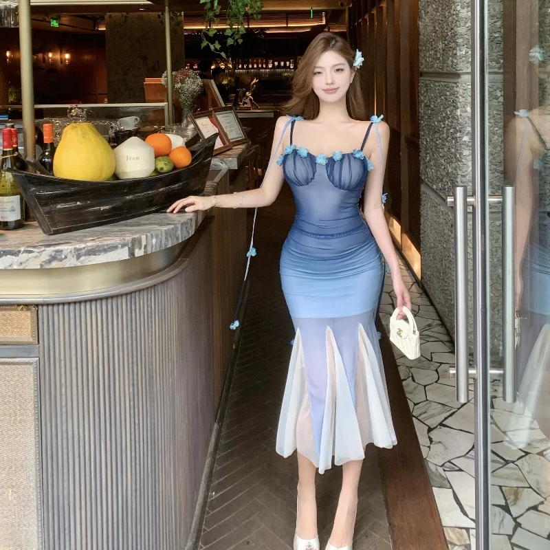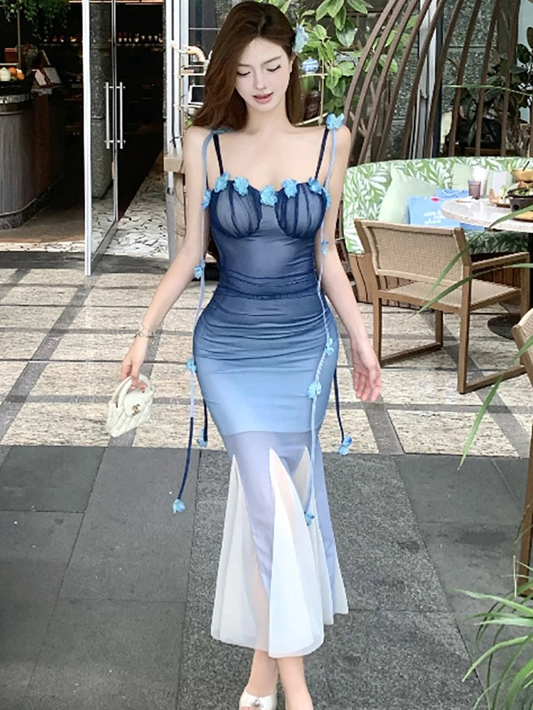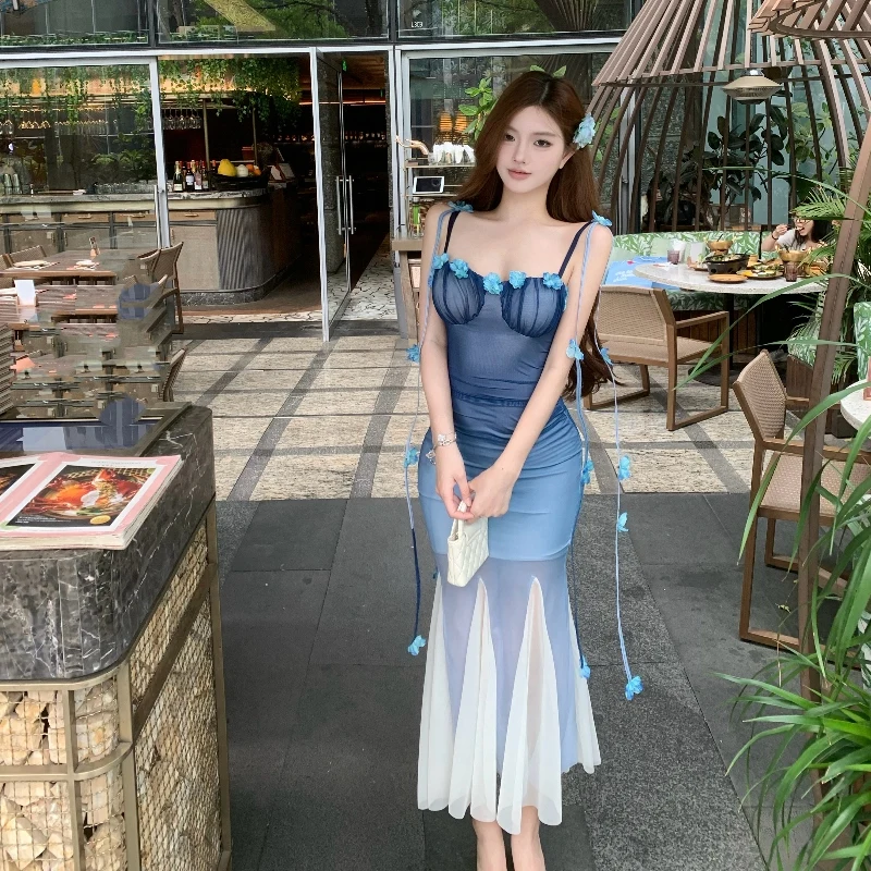 DAIIIBABYYY - Women Black Mesh Patchwork White Ruffled Long Dress Summer Fashion Chic Flower Sling Dresses 2025 New Elegant Bodycon Dress Gown