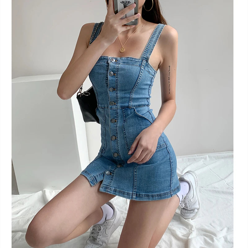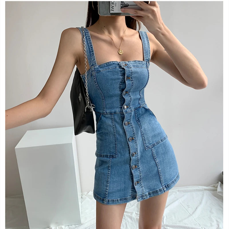 DAIIIBABYYY - Women Denim Dress Summer New Sexy Straps Skinny Short Skirt Blue Korean Fashion Classic Streetwear One Word Collar Jean Dress