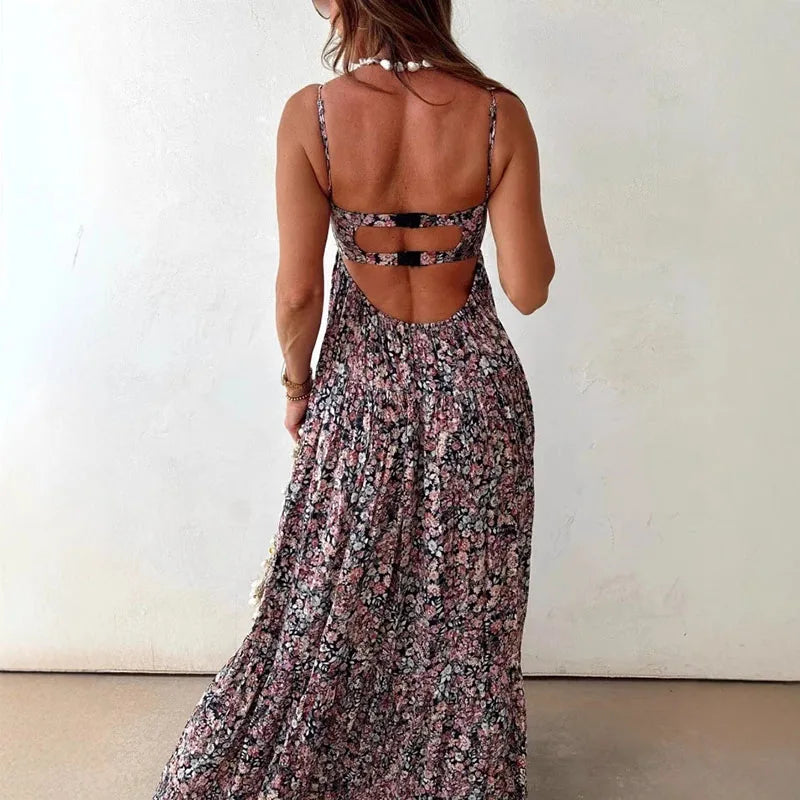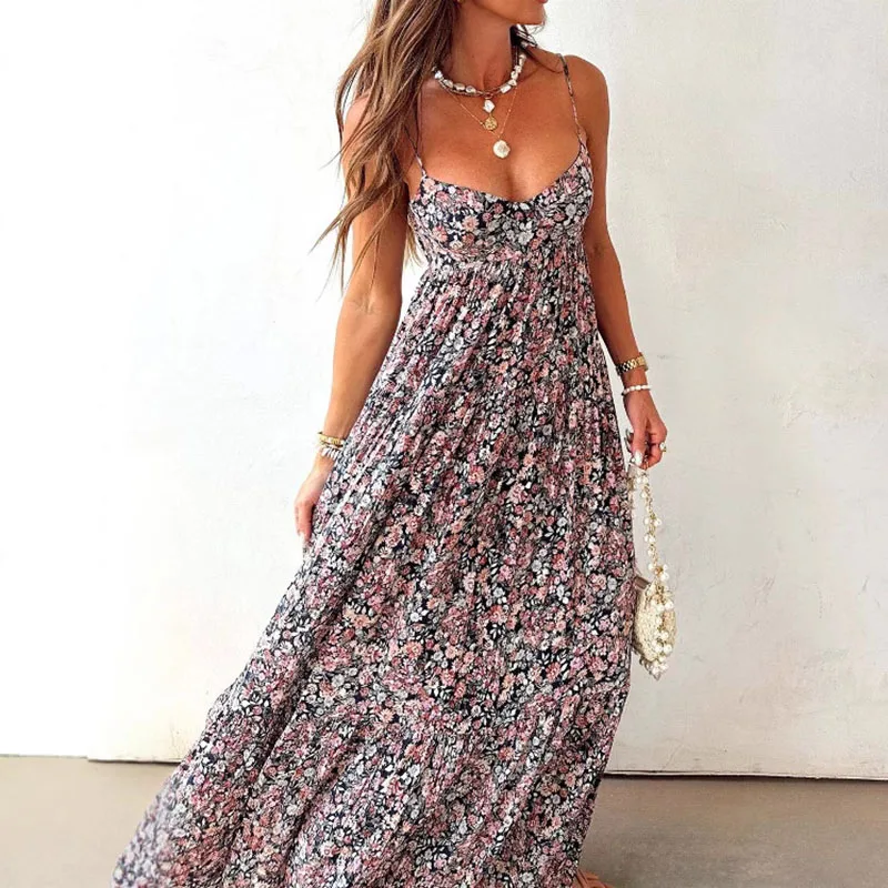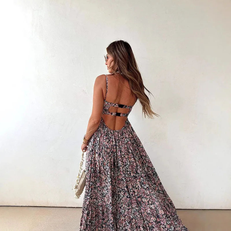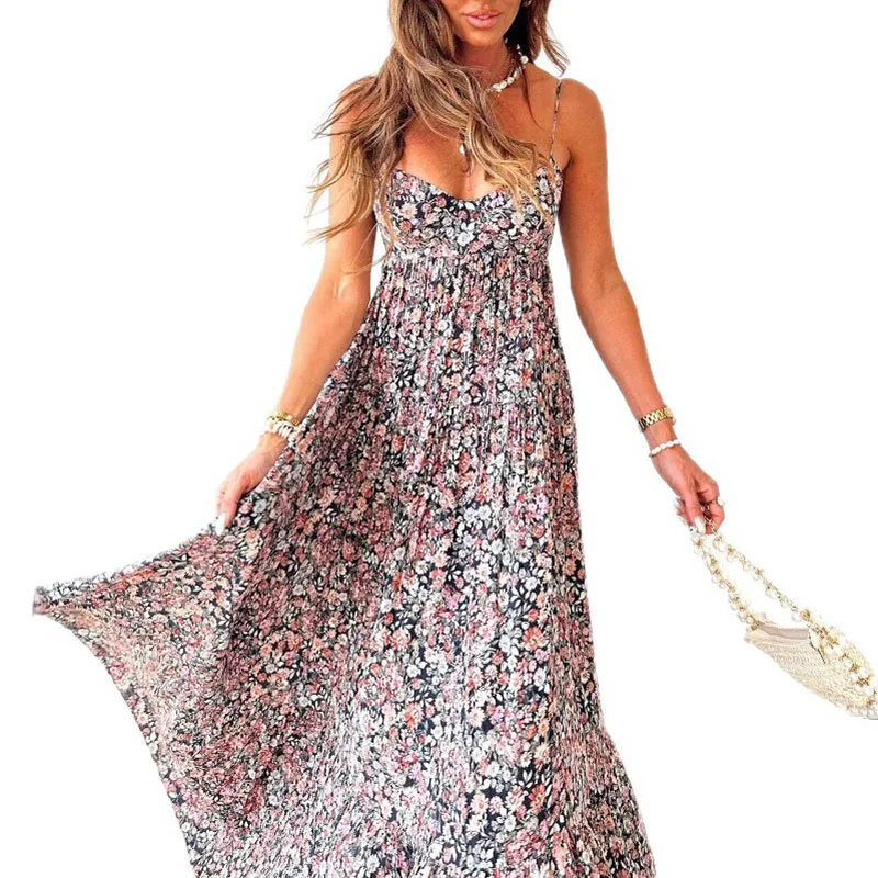 Daiiibabyyy Women Elegant Floral Print Sling Dress Sexy Off Shoulder Backless Long Pleated Party Dress Fashion Hight Waist Swing Bohe Dress