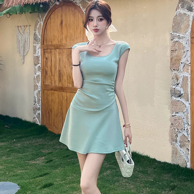 DAIIIBABYYY - Women Green Knitted Short Sleeve O-Neck Mini Dress Summer Pleated Bodycon Hip Wrap Dress 2025 Korean Fashion Casual Party Dress