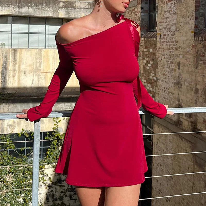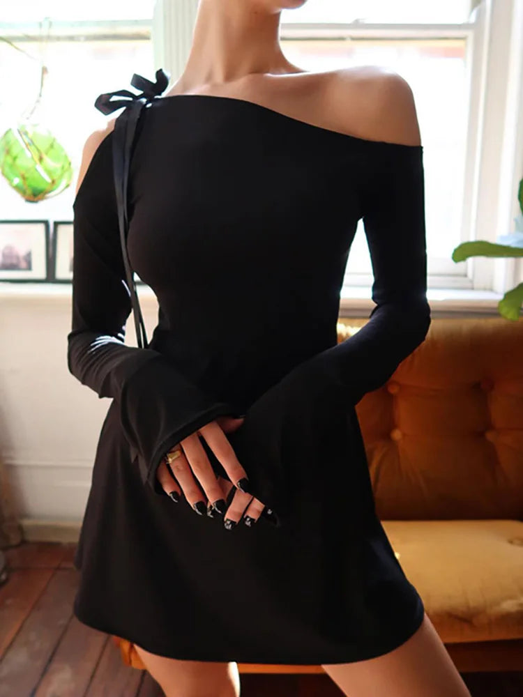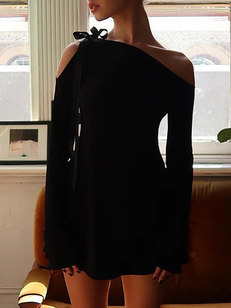 DAIIIBABYYY - Women Lace-Up Loungewear Sheath Dress, Spring Summer Long Sleeve Slim Mini Dress, Solid Sexy Skew Collar Ladies Party Dress