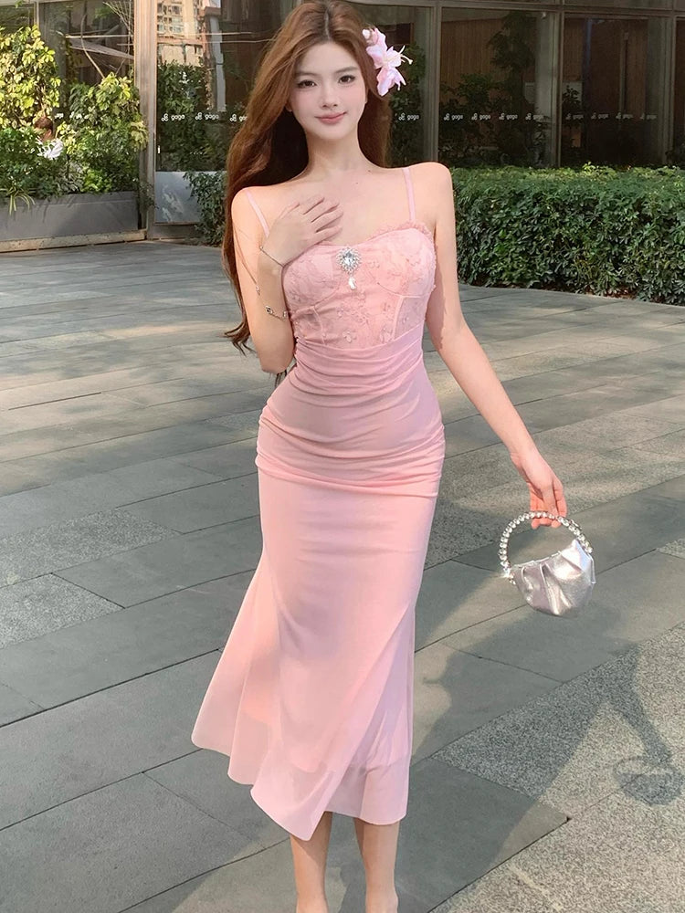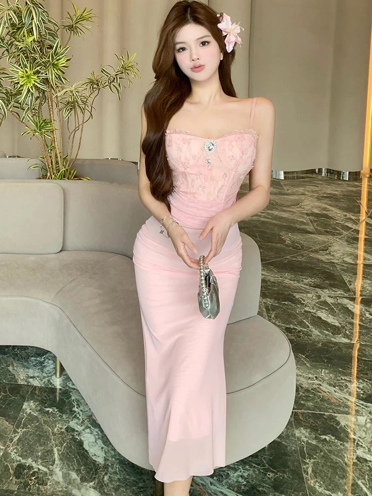 DAIIIBABYYY  -  Women Pink Mesh Patchwork Jacquard Diamonds Sling Long Dress Summer Elegant Casual Holiday Dress 2025 Korean Bodycon Party Dress