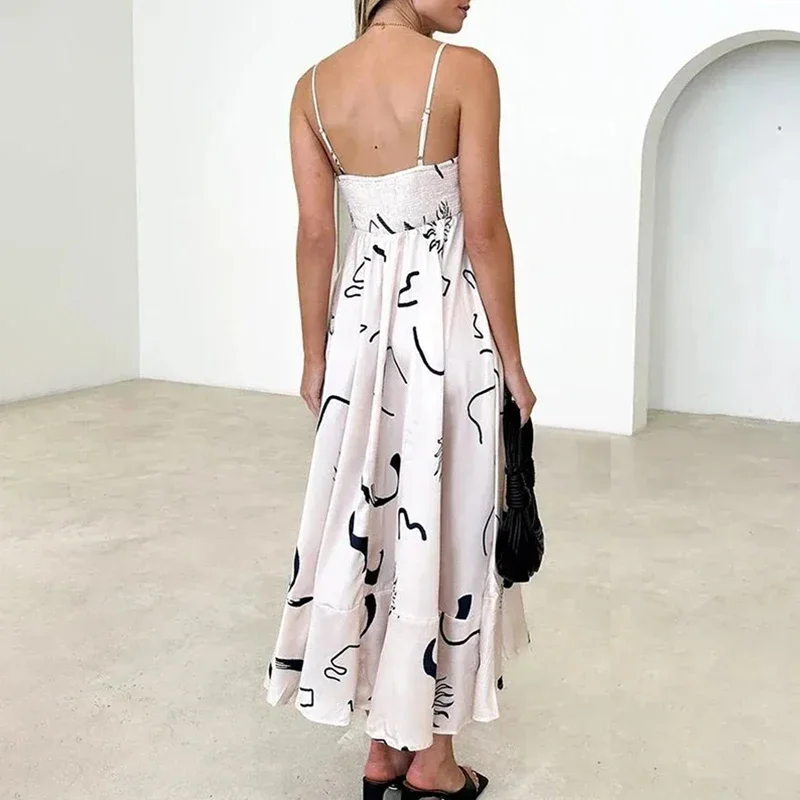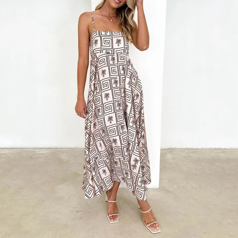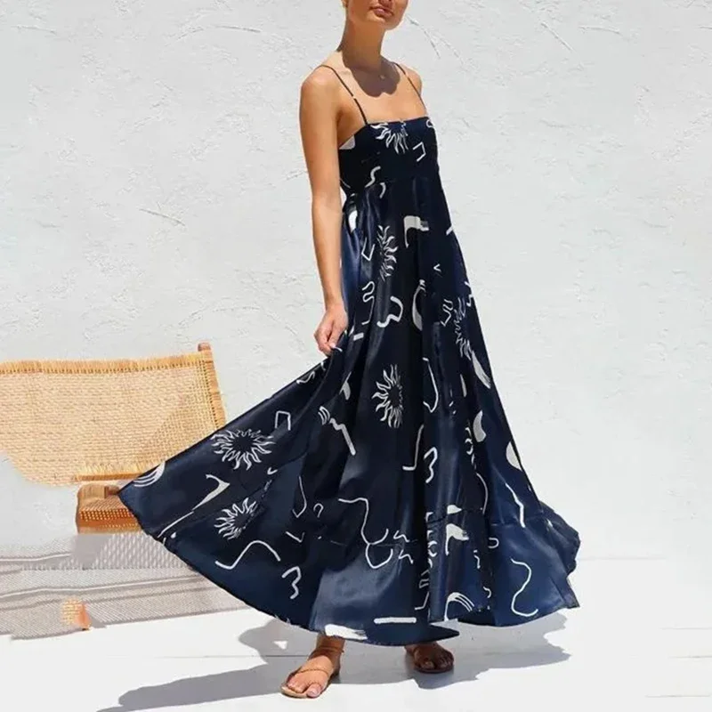 Daiiibabyyy Women Sexy Off Shoulder Spaghetti Straps Dress Summer Fashion Pattern Print Pleat Holiday Dress Elegant Loose Satin Party Dress
