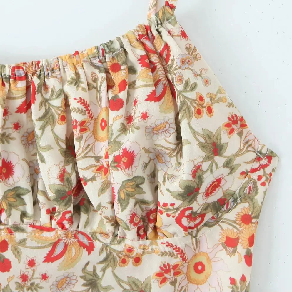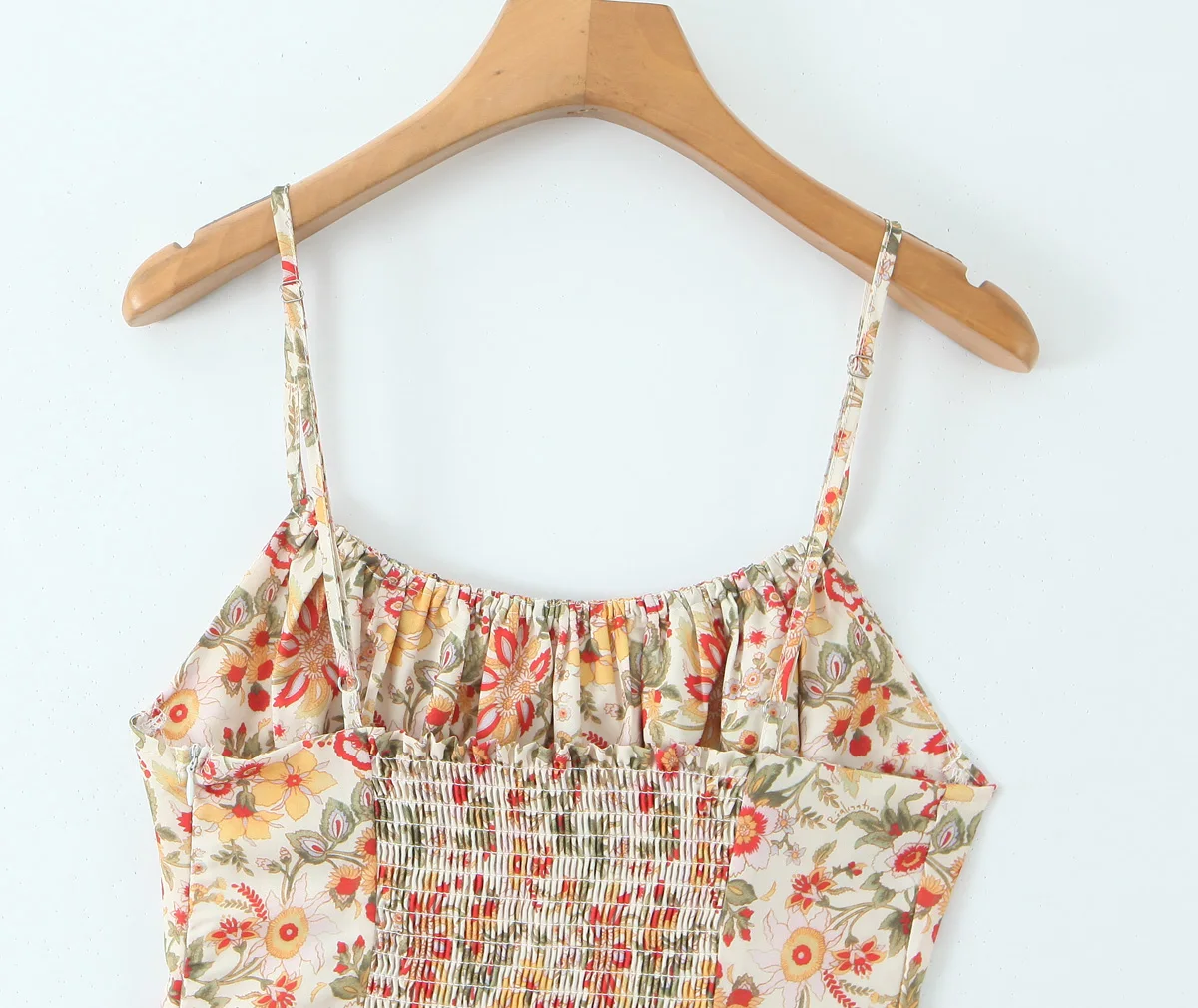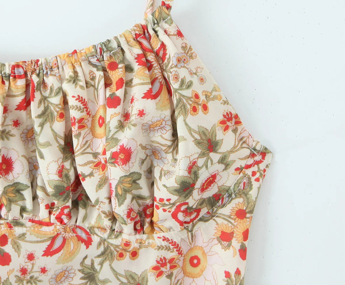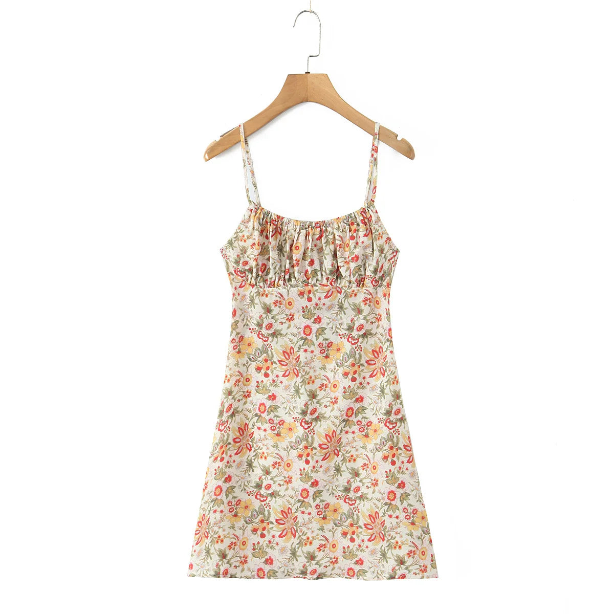 Daiiibabyyy Women Summer French Style Retro Flower Print Ruched Chest Sling Dress Elastic Back Short Chiffon Dresses Holiday Robe Vestido