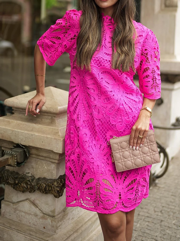 DAIIIBABYYY - Women Sweet Half Sleeve Hollow Out Straight Dress Spring Zipper Loose Stand Collar Ladies Mini Dress Elegant Streetwear Vestidos