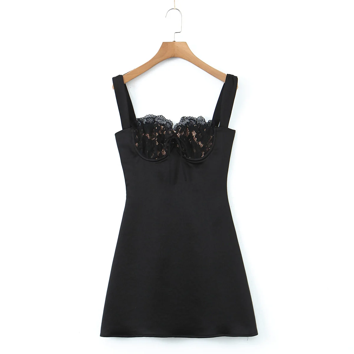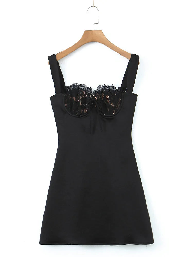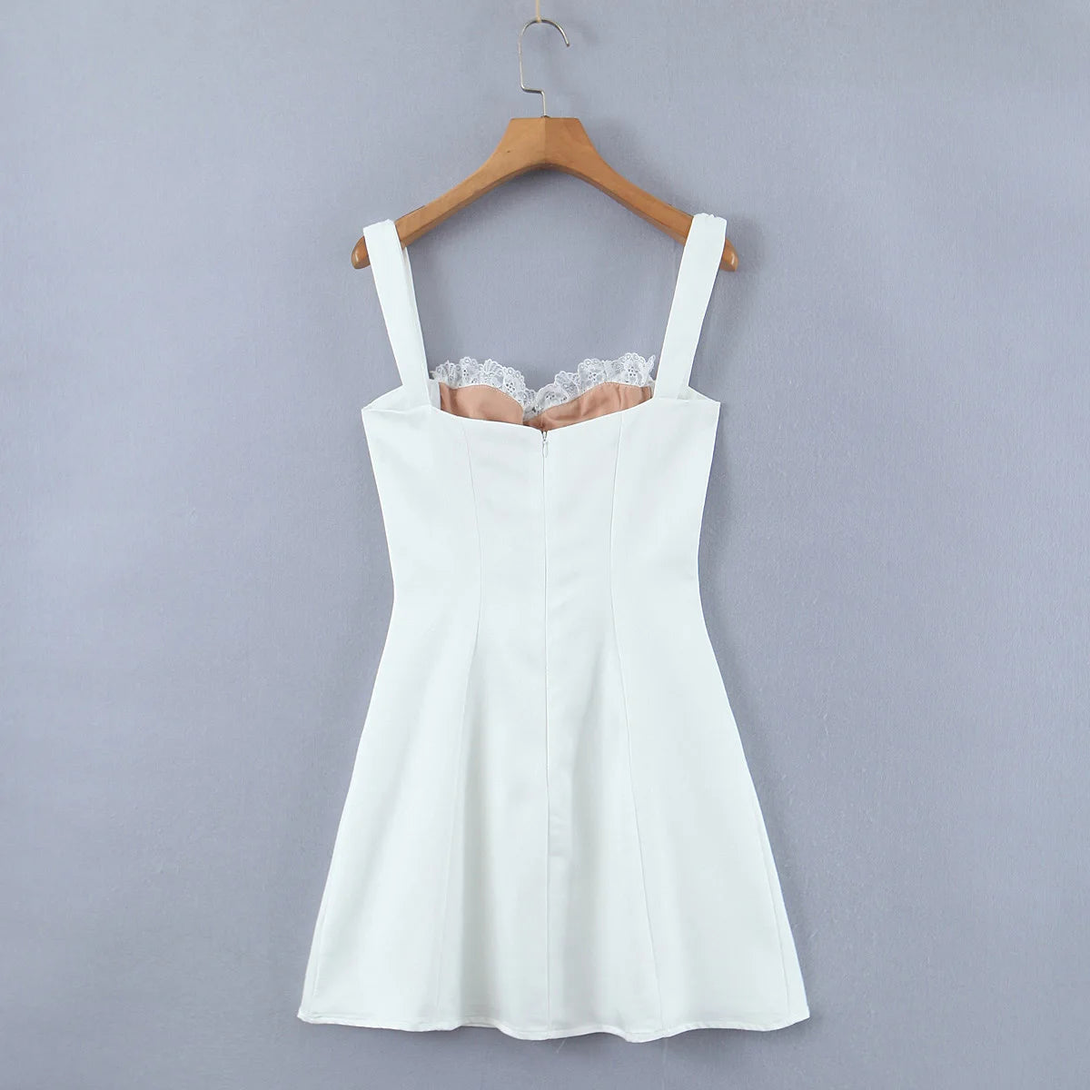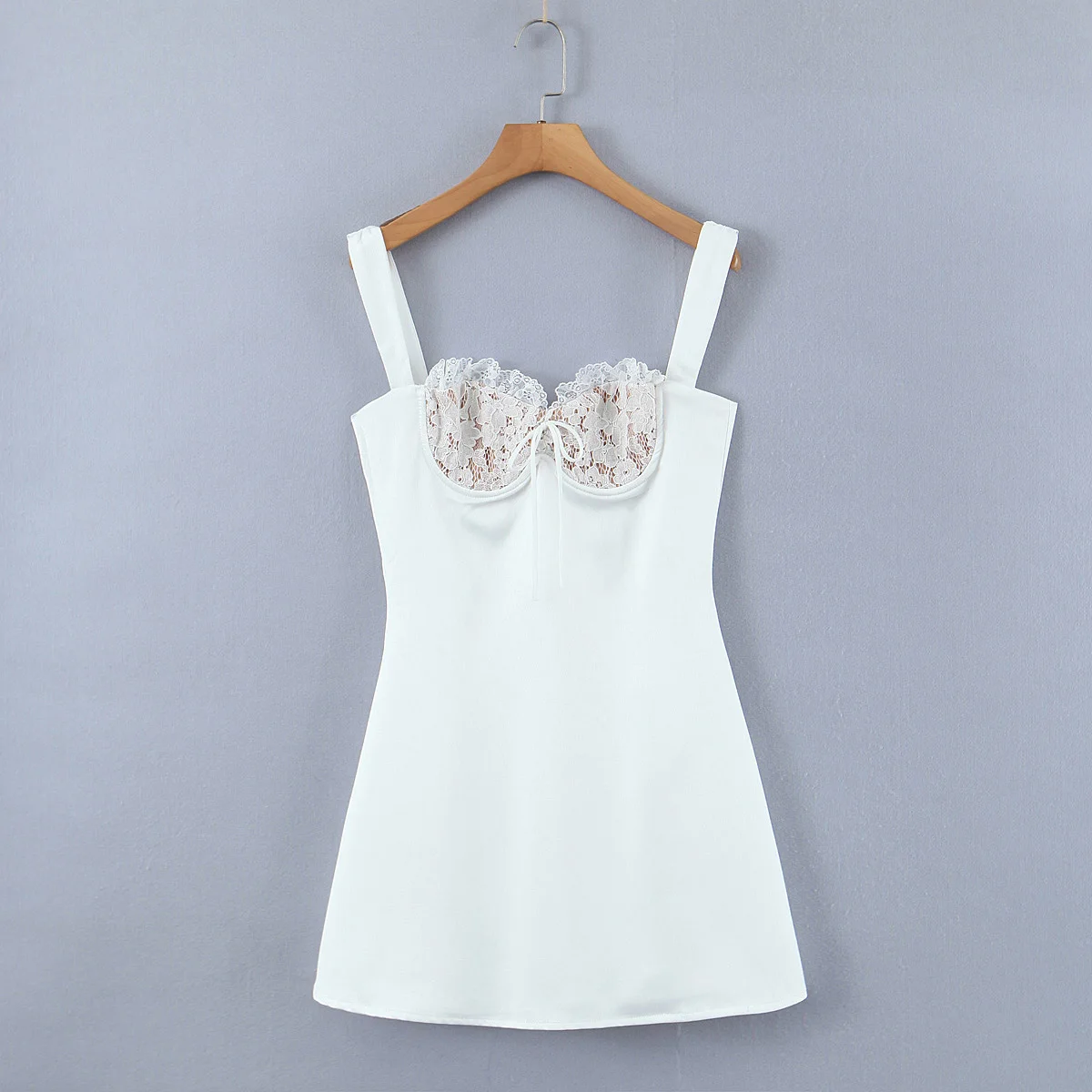 Daiiibabyyy Women V neck Backless Party Skater Short Sling Dress Sexy Stitching Lace Bra Corset Style Spaghetti Strap Mini Dresses