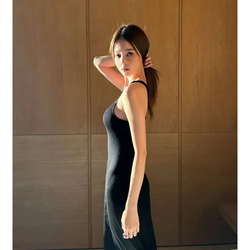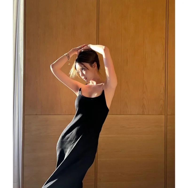DAIIIBABYYY - Women's Dress Pure Black Clothing Self Cultivation Sling Skirt Design Temperament Resort Summer NEW Female Knitted Skirt