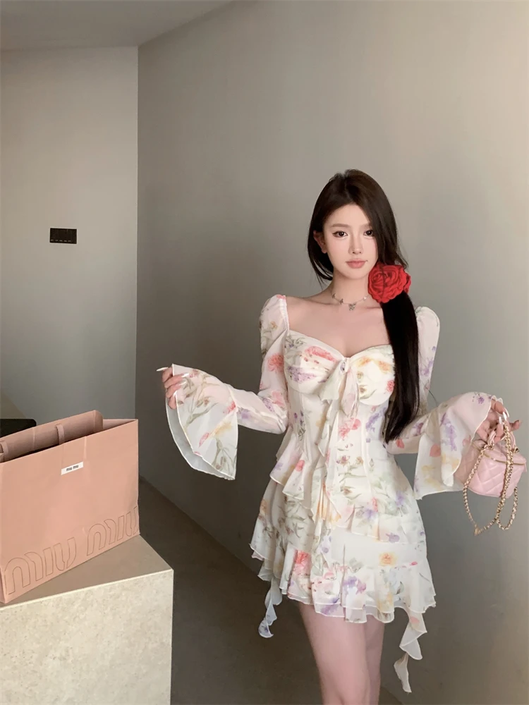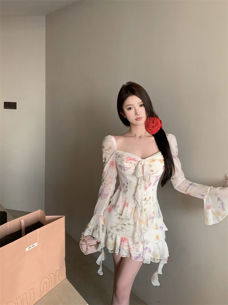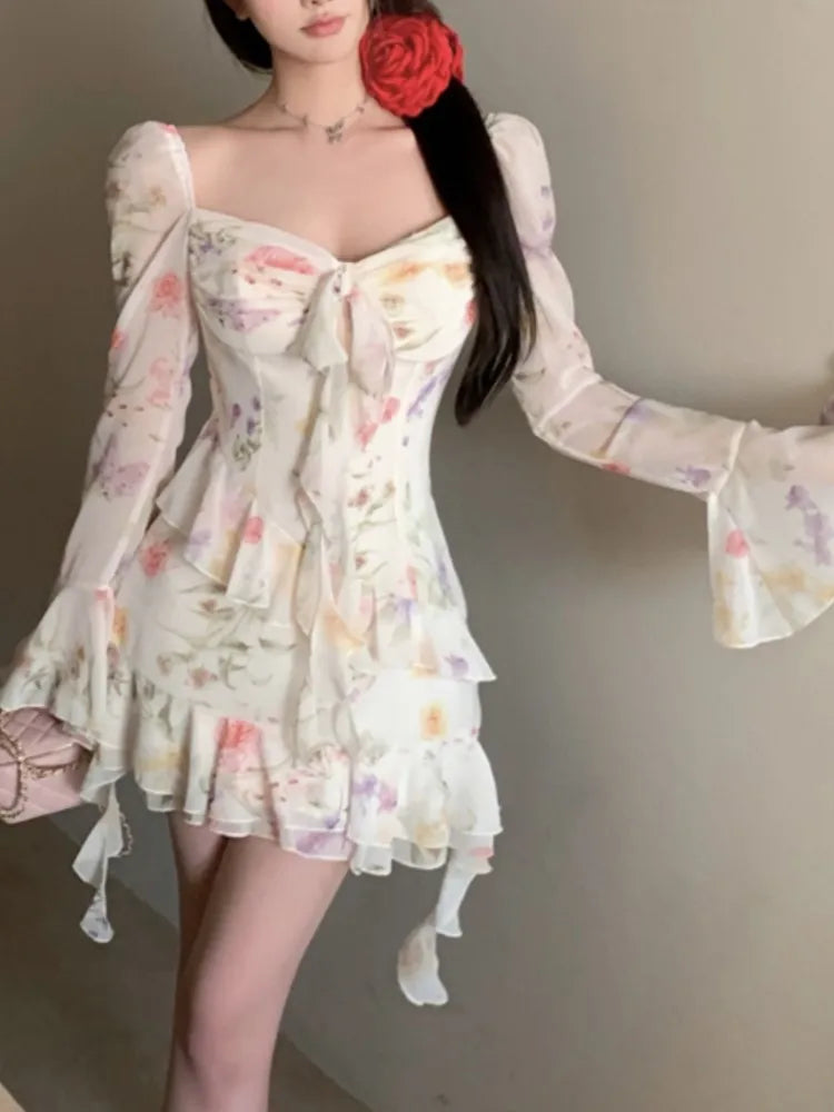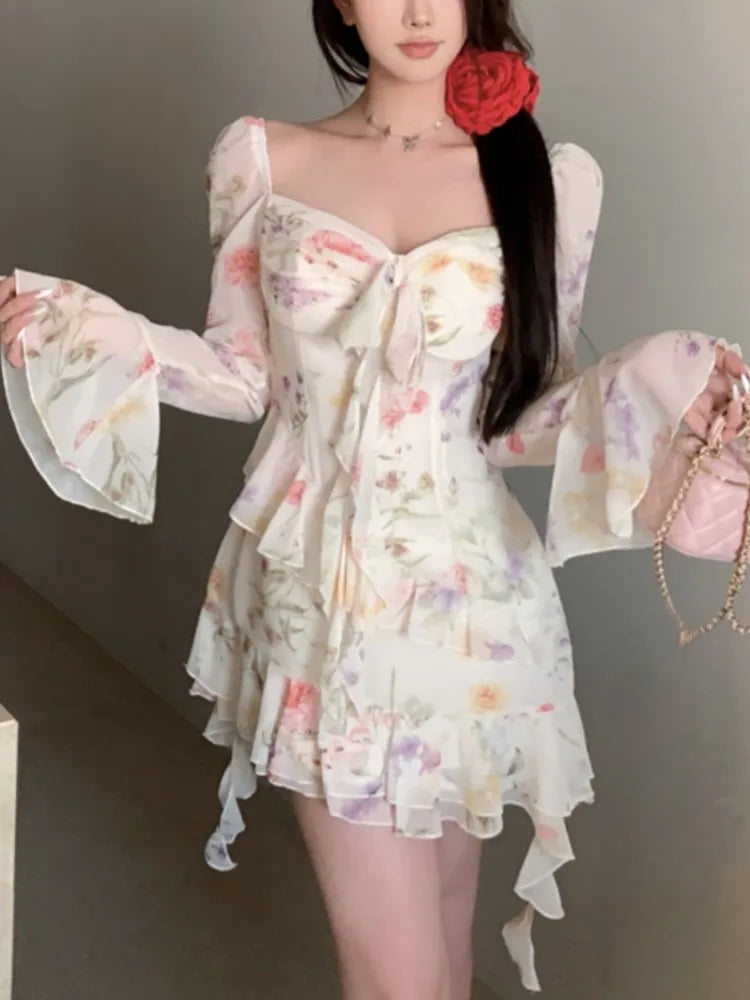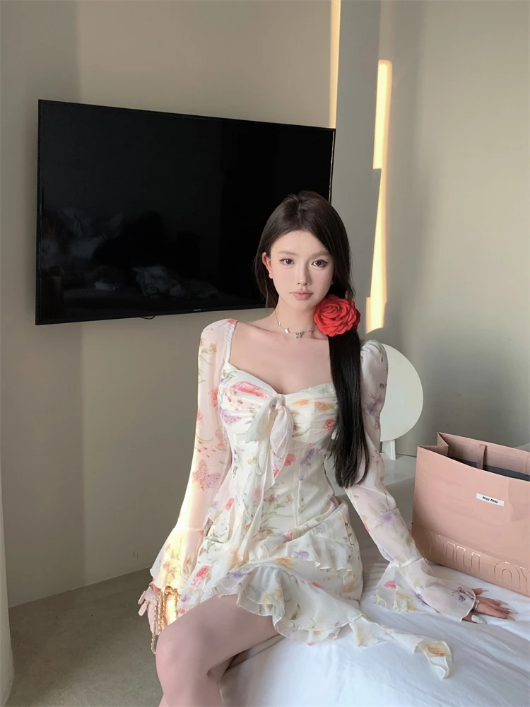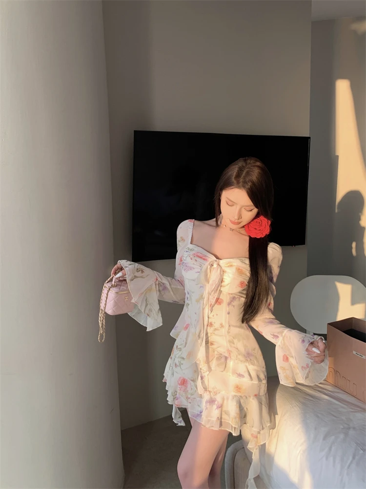 DAIIIBABYYY - Women's Fairy Dress New French Square Collar Long Sleeve Sweet Floral Print Dresses Fashion Ruffled Beach Vocation A-Line Frock