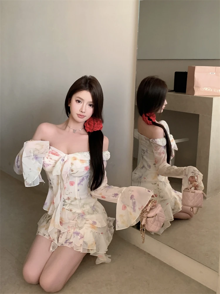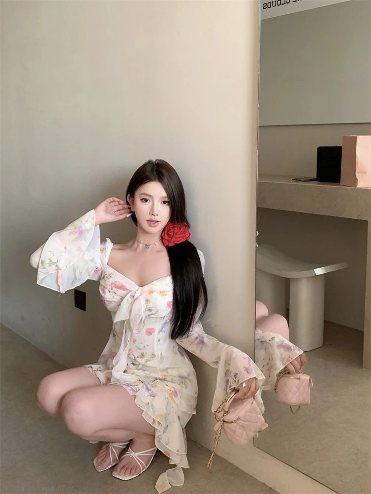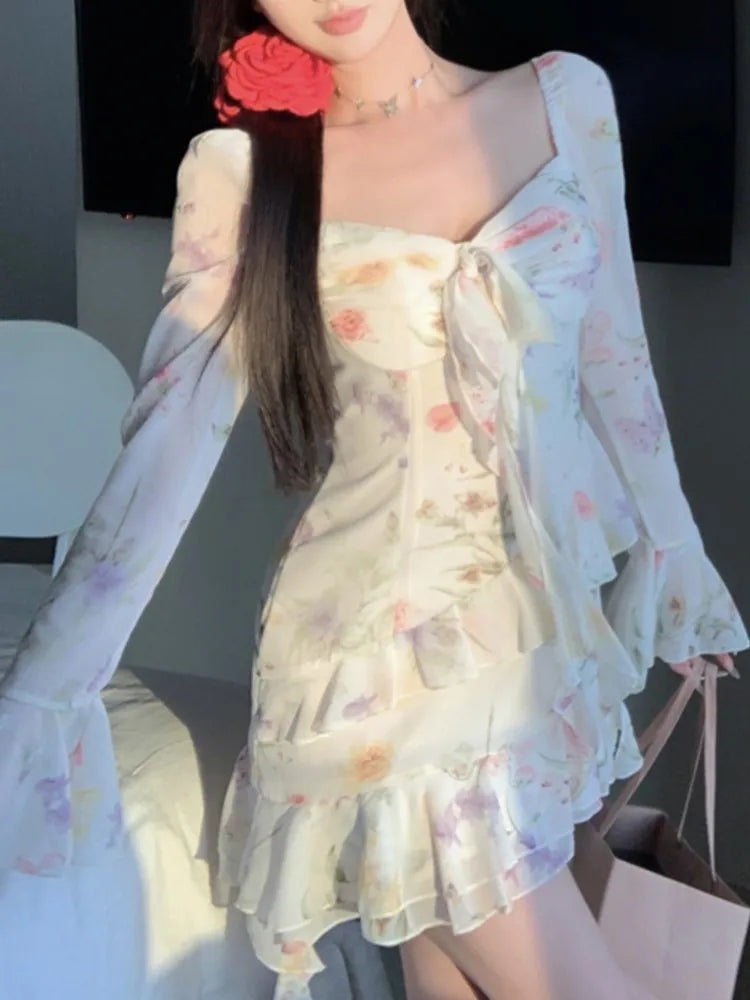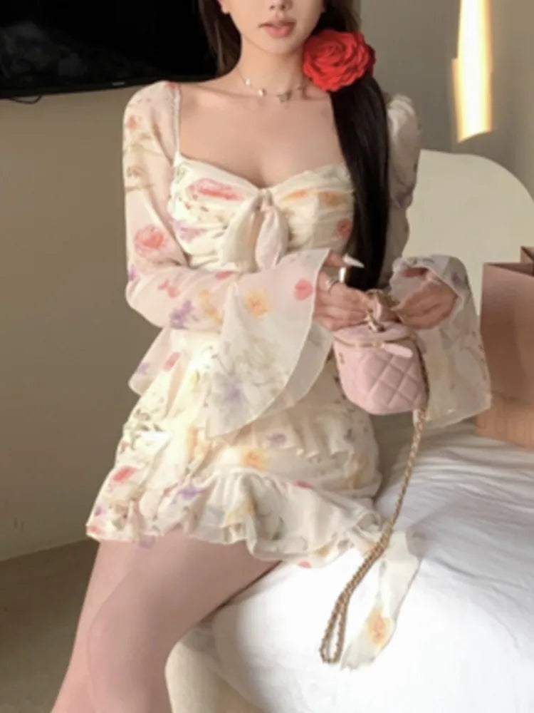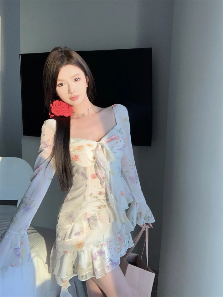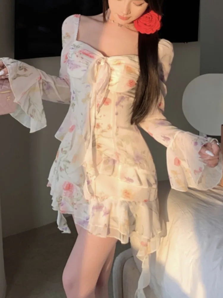 DAIIIBABYYY - Women's Fairy Dress New French Square Collar Long Sleeve Sweet Floral Print Dresses Fashion Ruffled Beach Vocation A-Line Frock