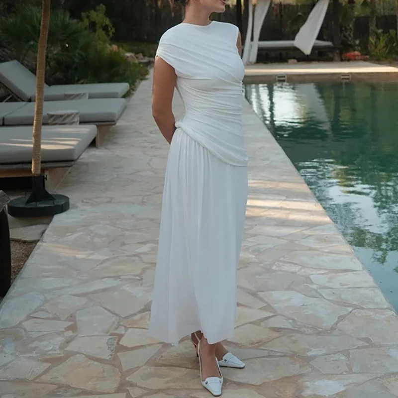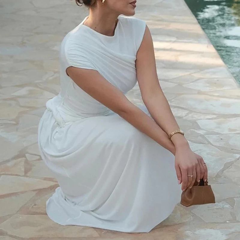 DAIIIBABYYY - Women's Fashion Draped Solid Long Dress Casual Sleeveless Patchwork Maxi Dress Elegant O Neck High Waist Slim Party Dresses