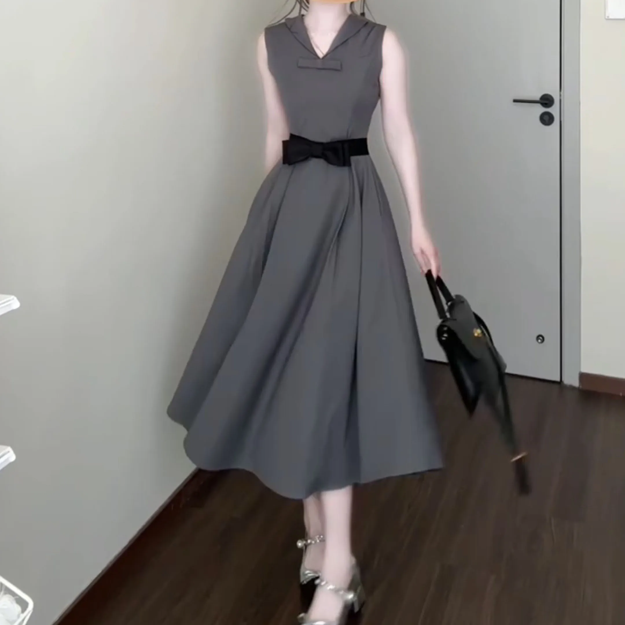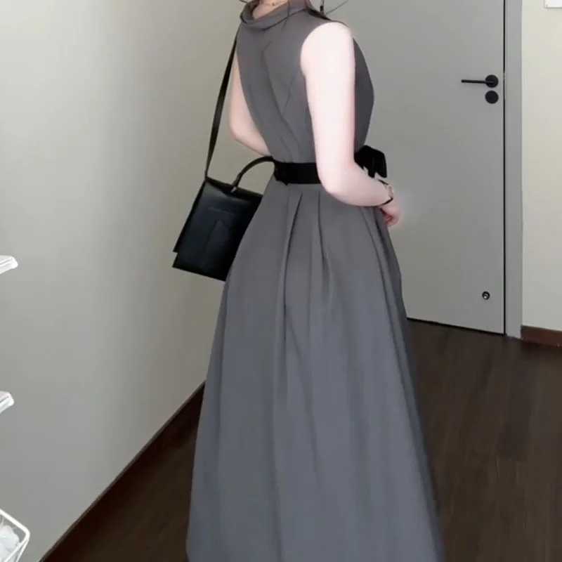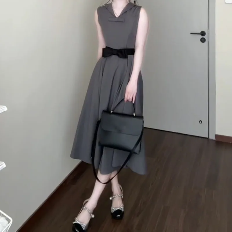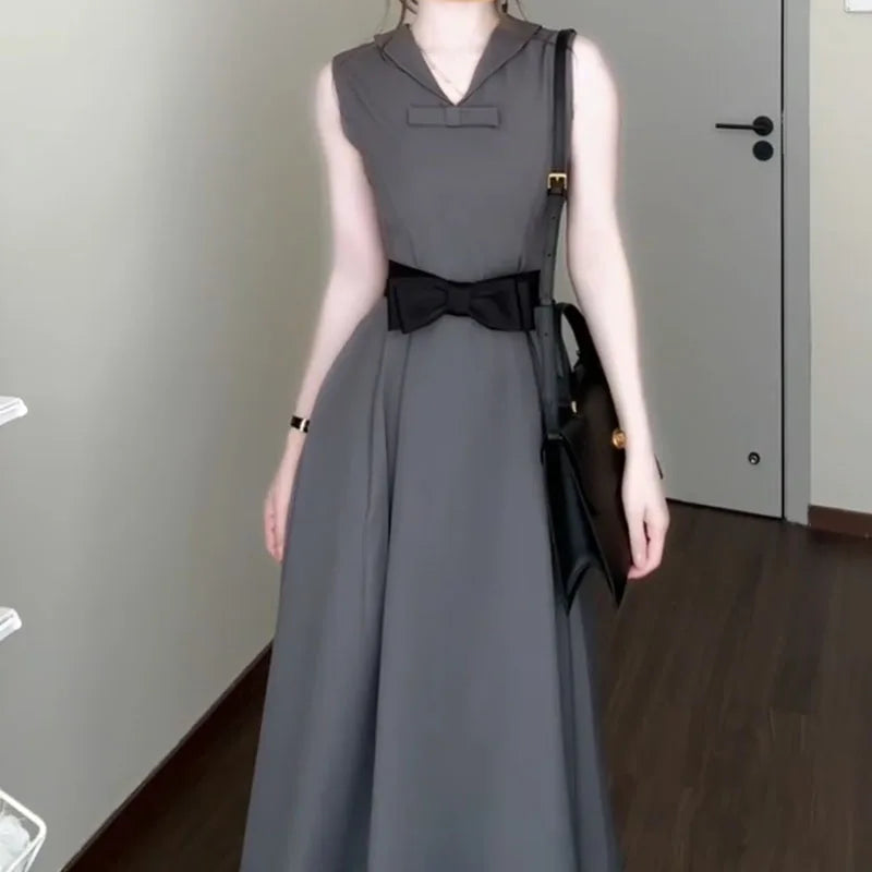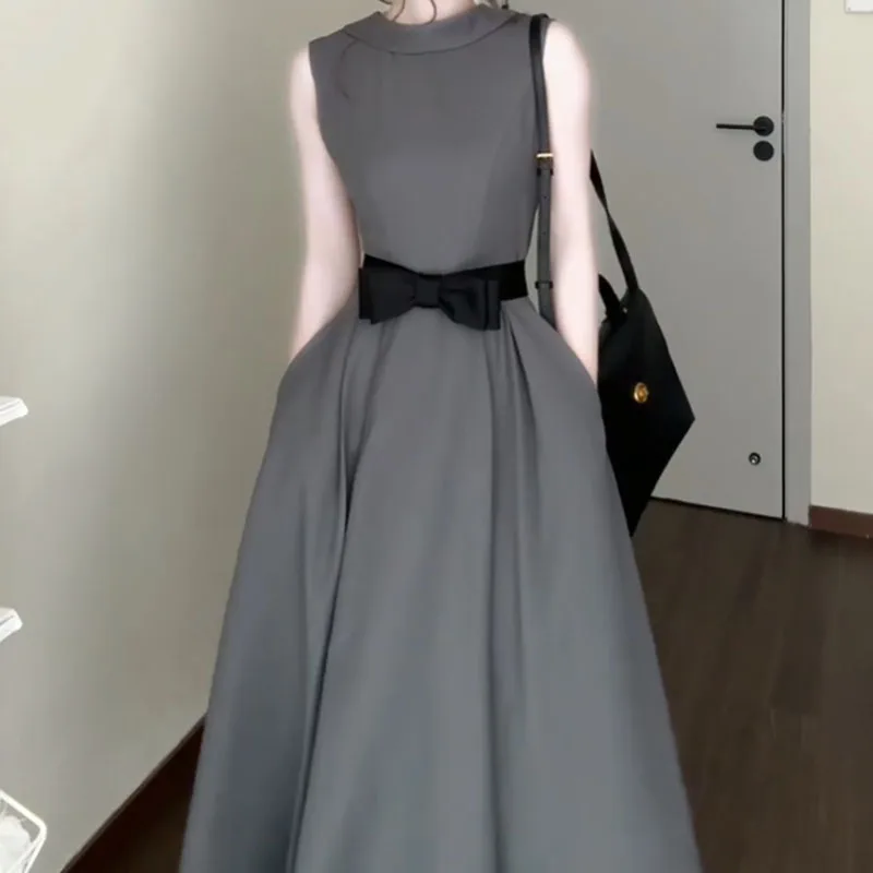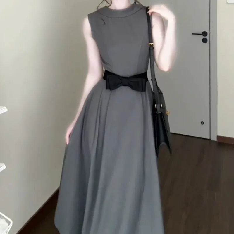 DAIIIBABYYY - Women's New French Round Neck Grey Dress Two Sided Wear Style Summer Butterfly Knot Waist Design Sleeveless Ankle-Length Dresses