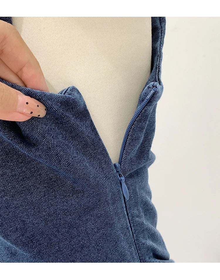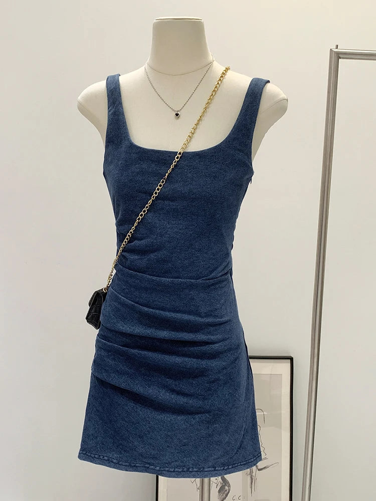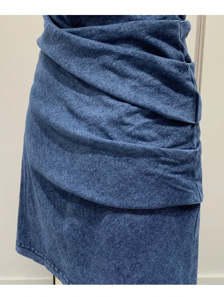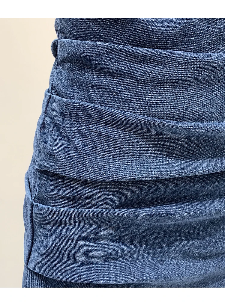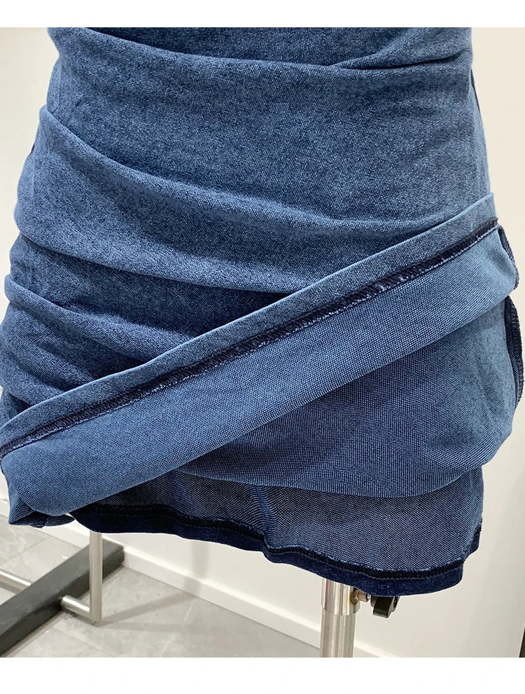 Daiiibabyyy Women's Summer Blue Denim Short Dress High Waist Folding Strap Hip Wrapping Slimming Fit Mini Dresses 2025 New Style Fashion