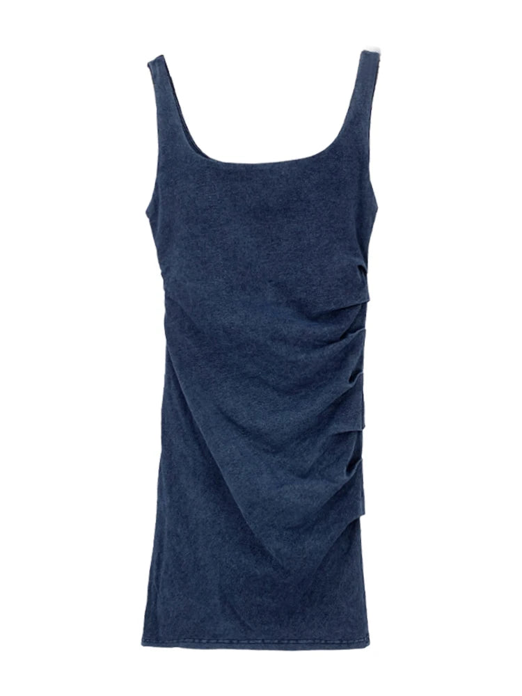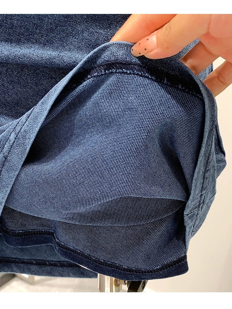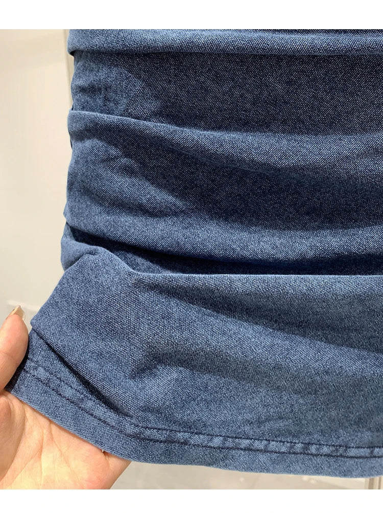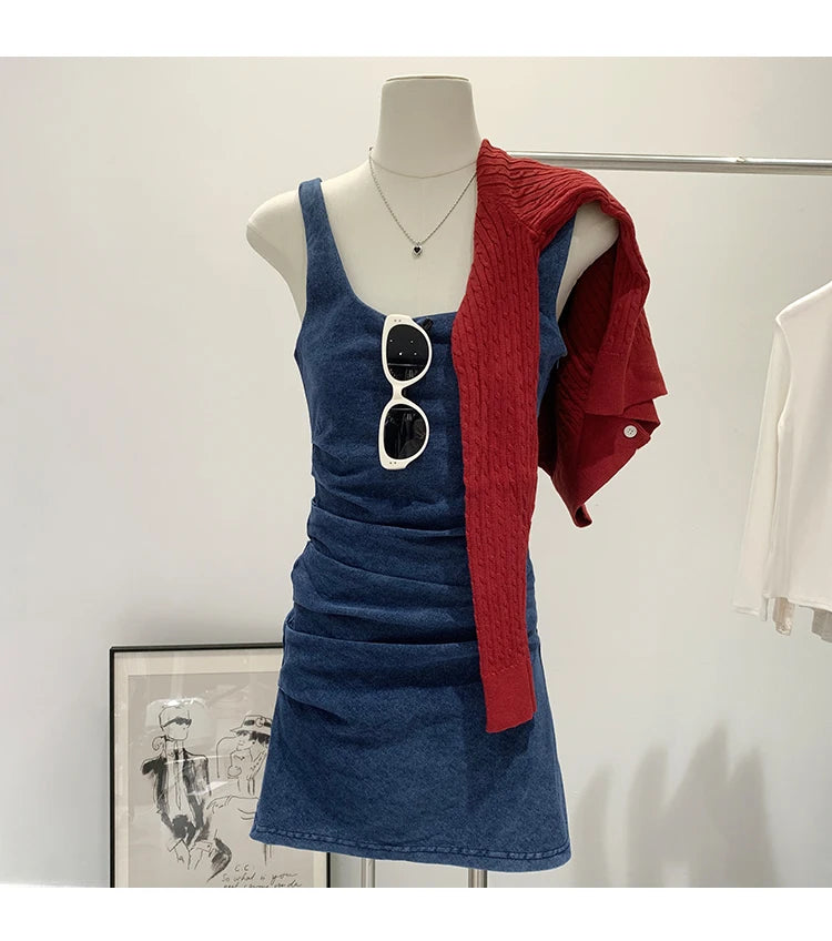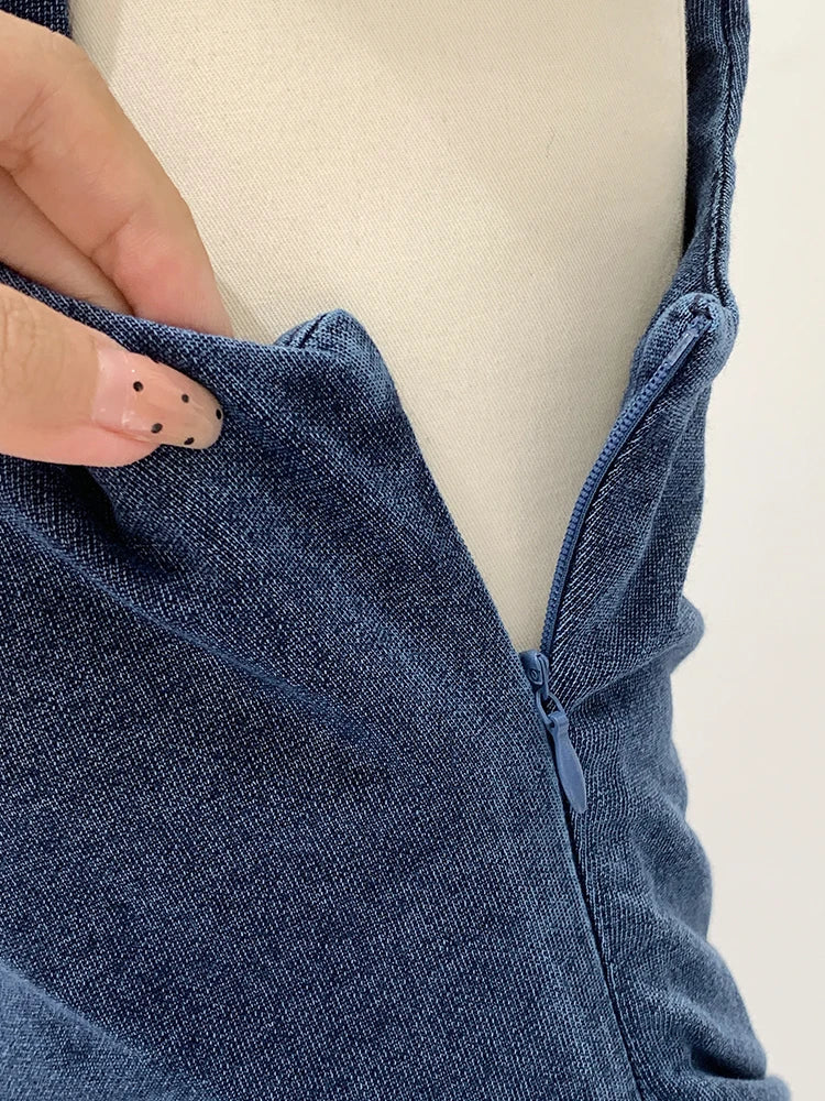 Daiiibabyyy Women's Summer Blue Denim Short Dress High Waist Folding Strap Hip Wrapping Slimming Fit Mini Dresses 2025 New Style Fashion