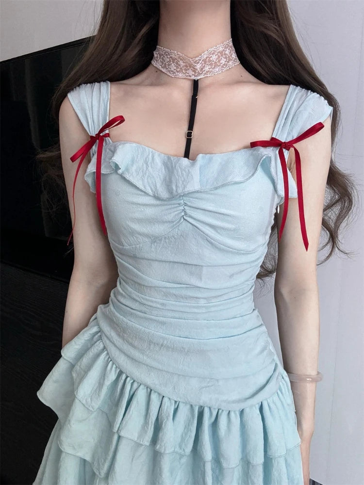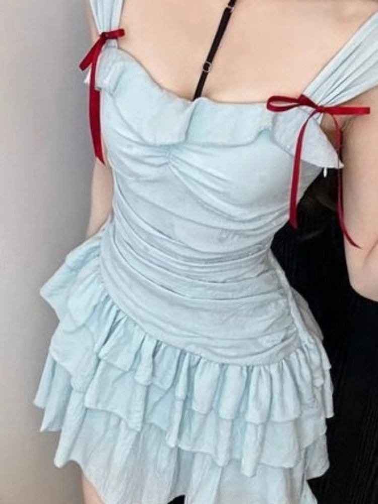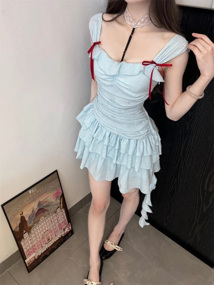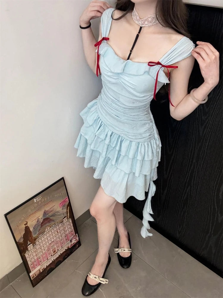 Daiiibabyyy Y2k Aesthetic Slash Neck Women A-Line Dress Bow Sweet Irregular Ruffled Fairy Dresses Harajuku Solid Grunge Pleated Vestidos