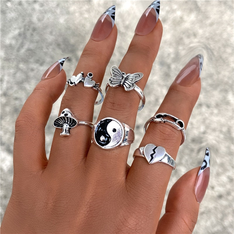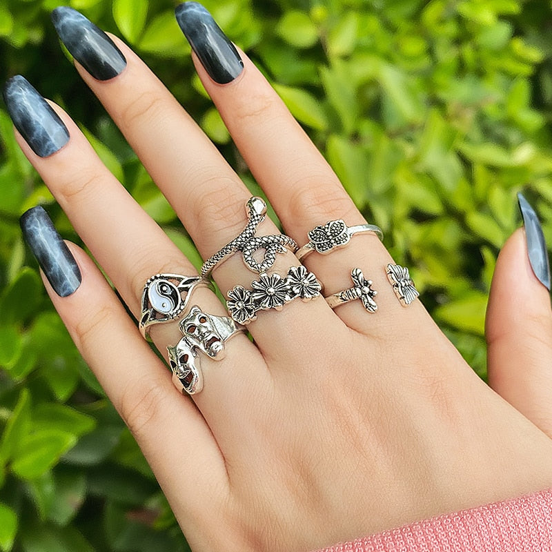 17KM Retro Silver Color Flower Butterfly Skull Rings Set For Women Men Punk Hiphop Animal Angel Wings Finger Rings Gift Jewelry