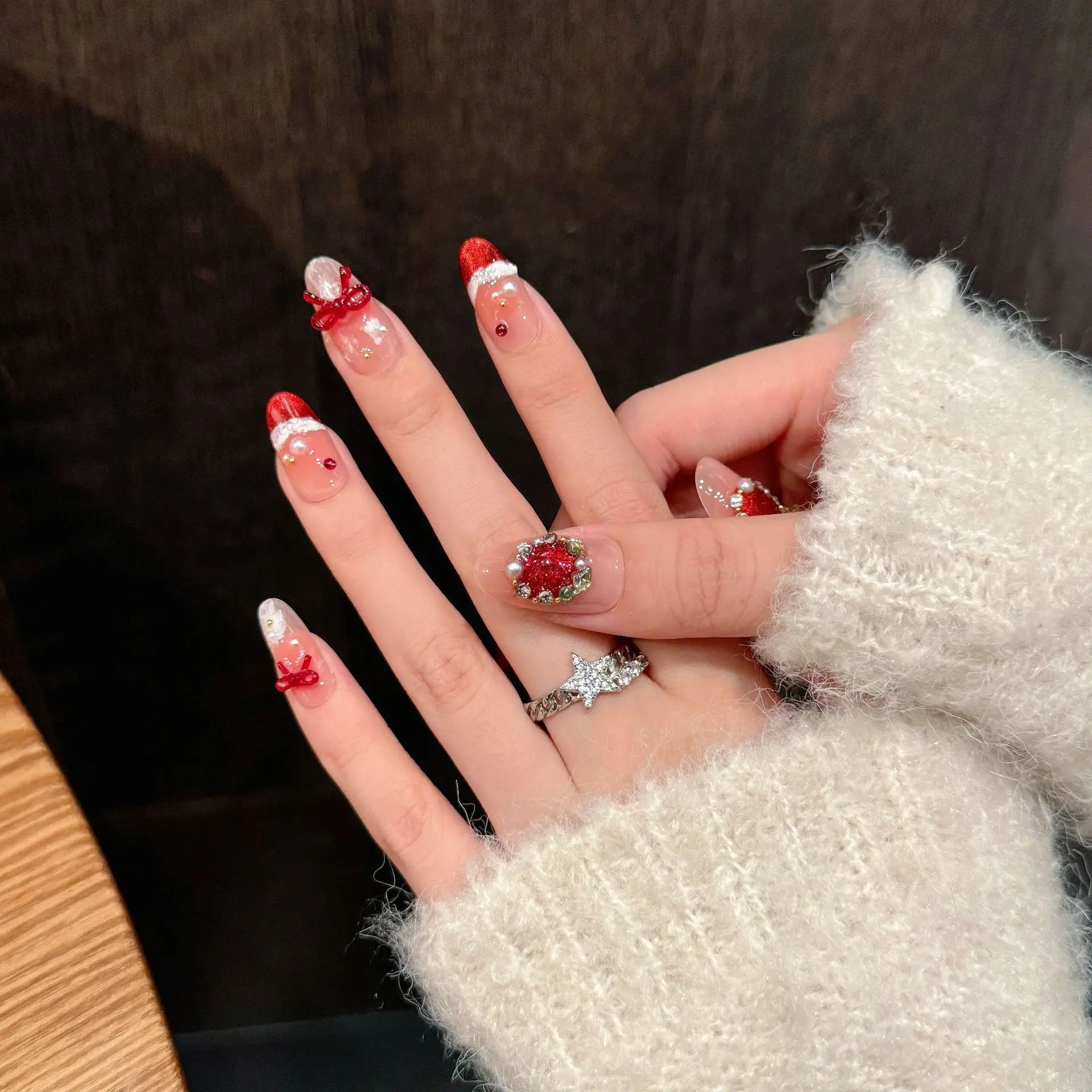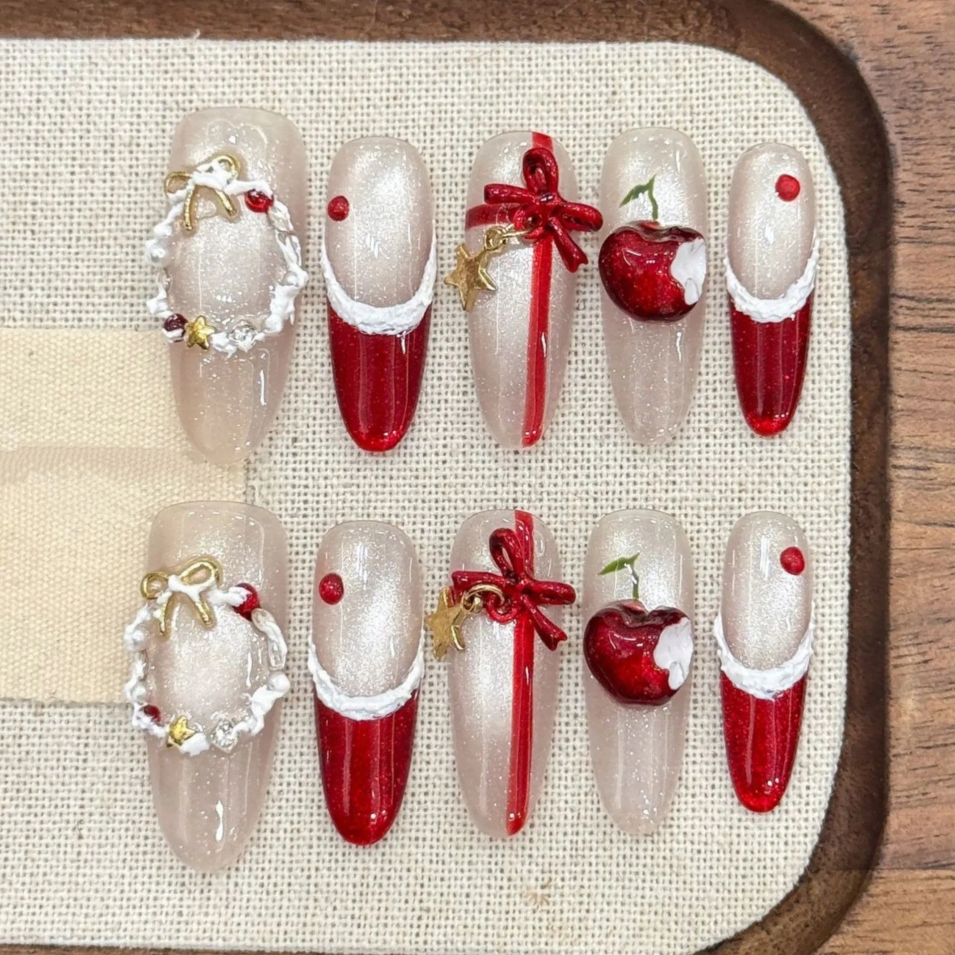 Daiiibabyyy 10pcs Cat's Eye Red Handmade False Nail Tips Bow Lines Design Long Oval Nail Rhinestone Press on Nails Art Wearable Fake Nail