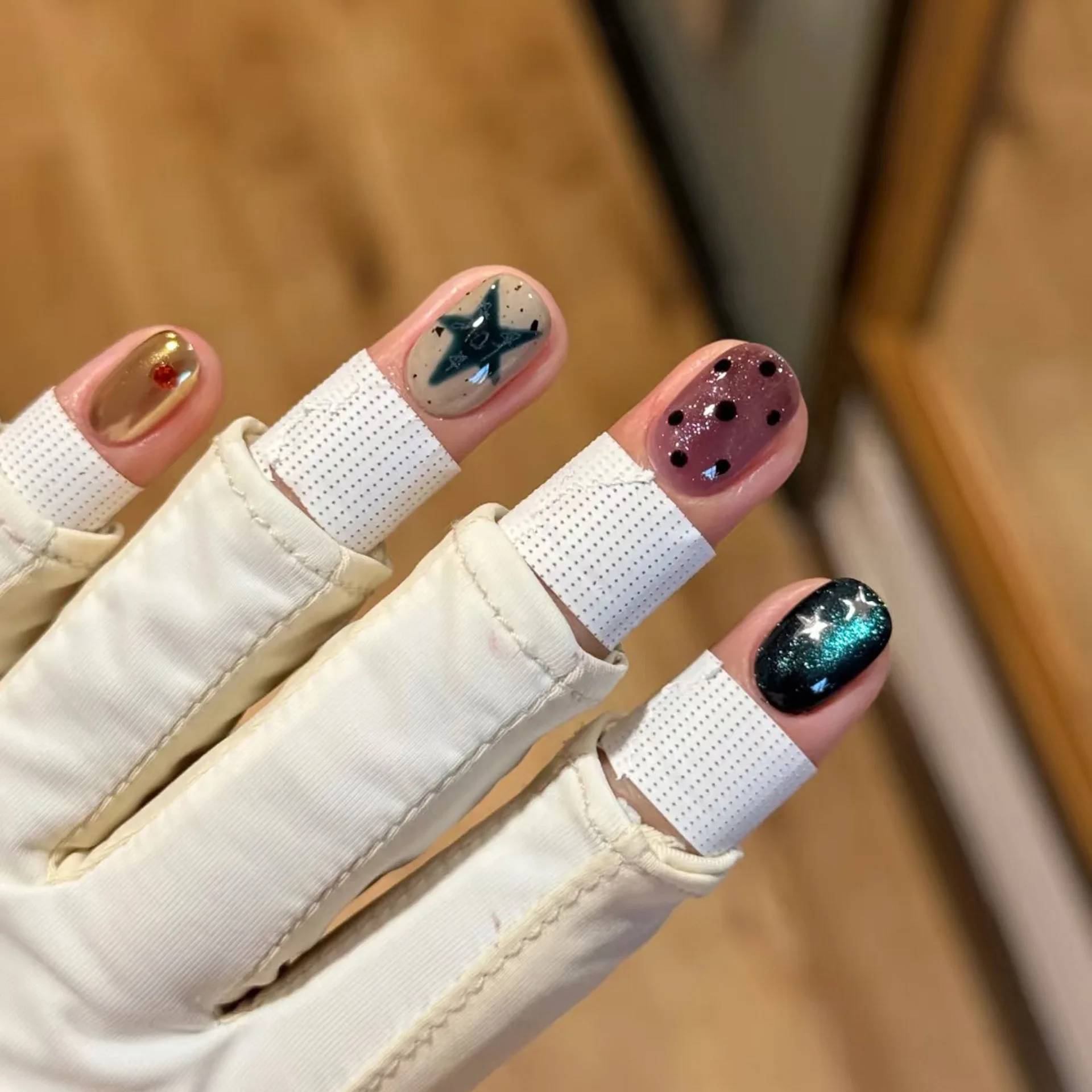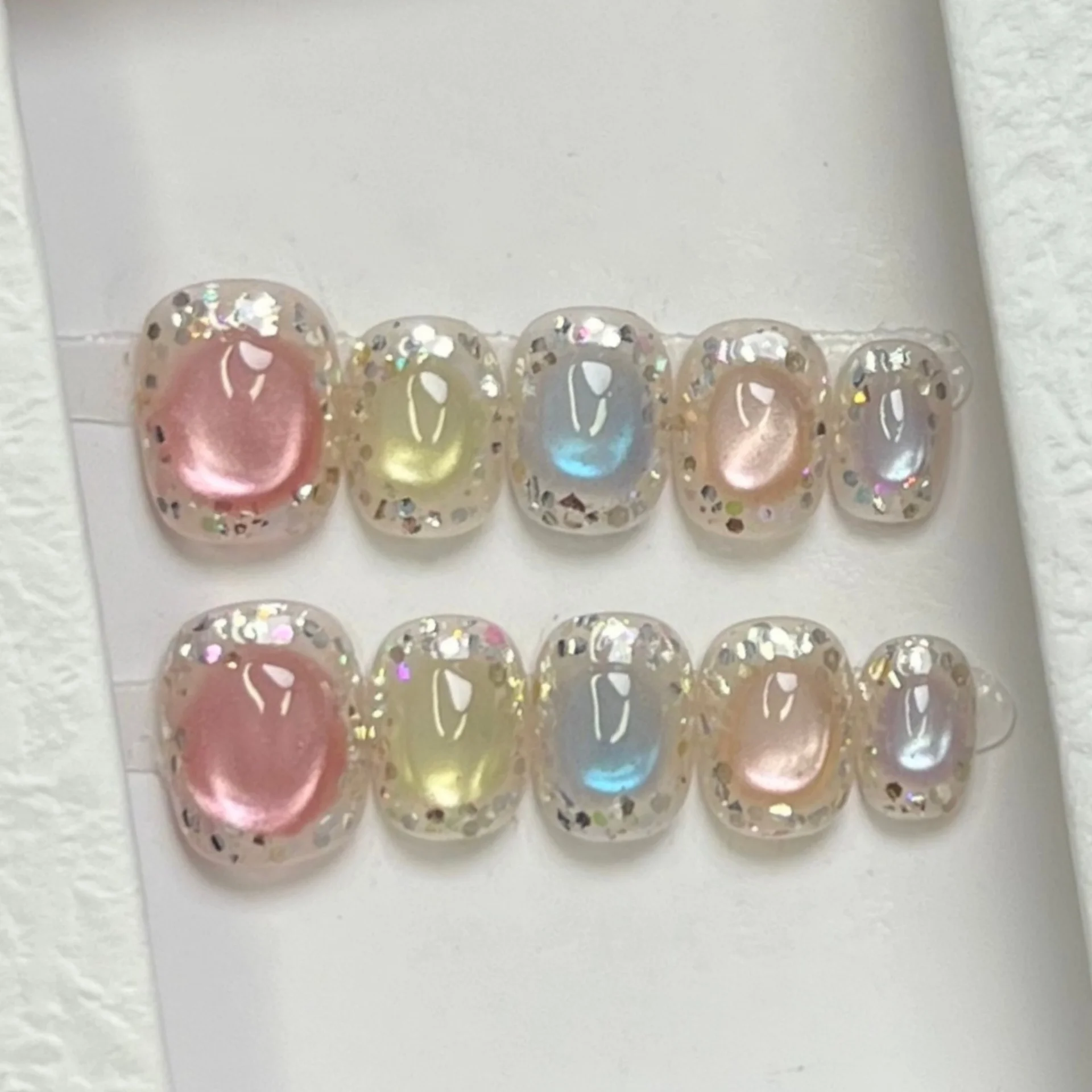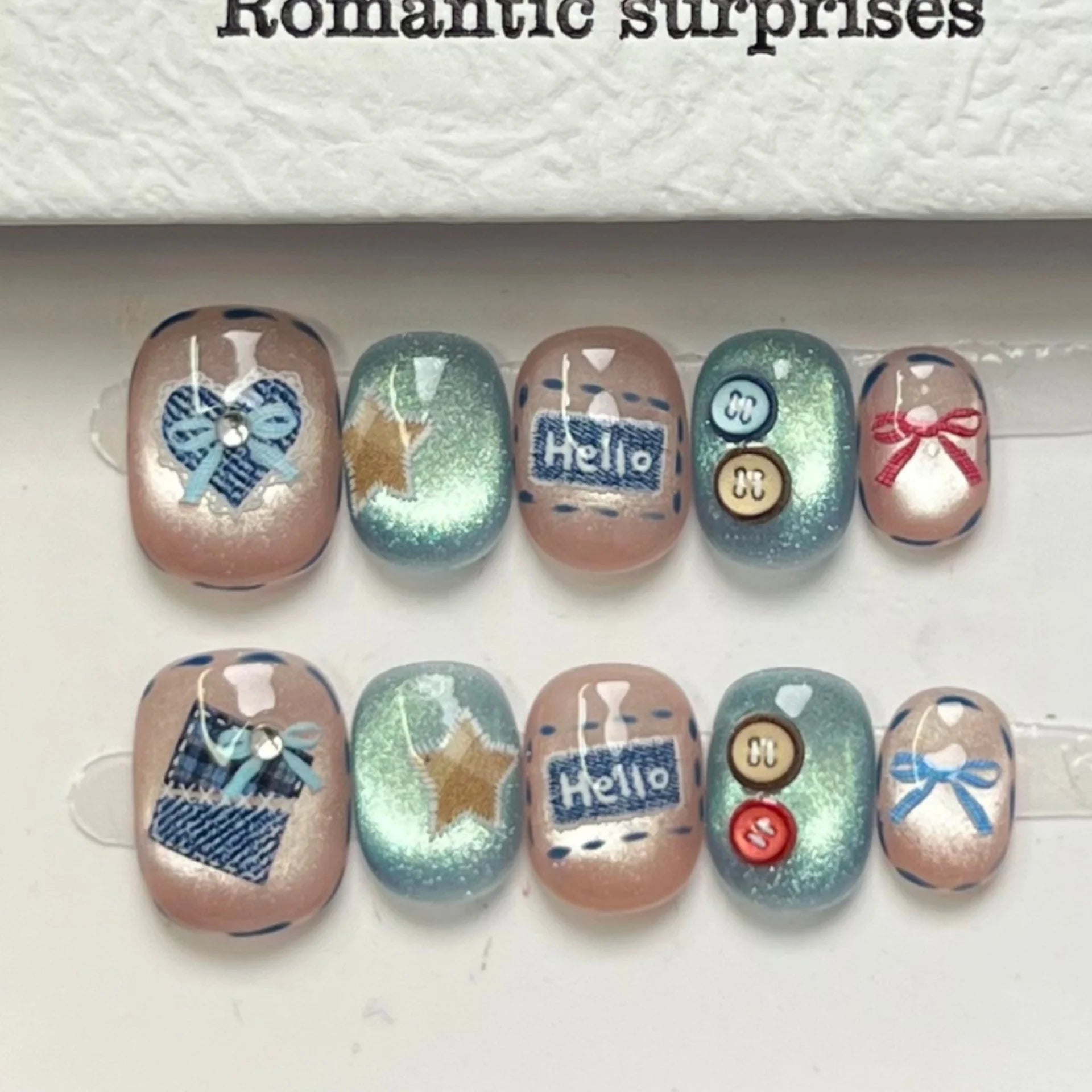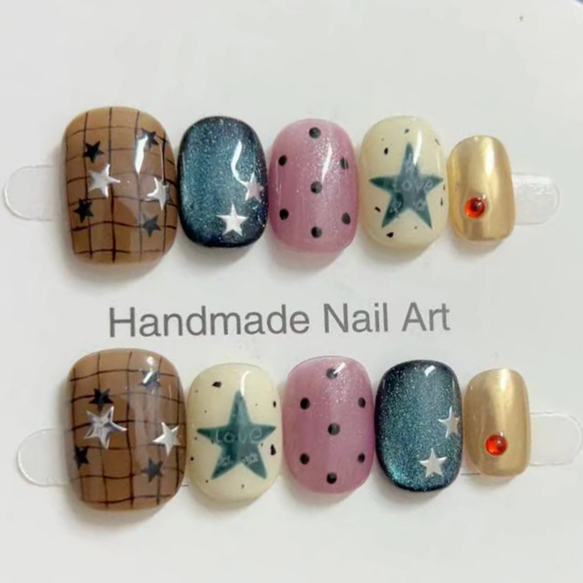 Daiiibabyyy 10pcs Handmade False Nails Art Blue Gradient Short Square Round Press on Nails Tips Cute Bow Button Fake Nail Set Denim Manicure