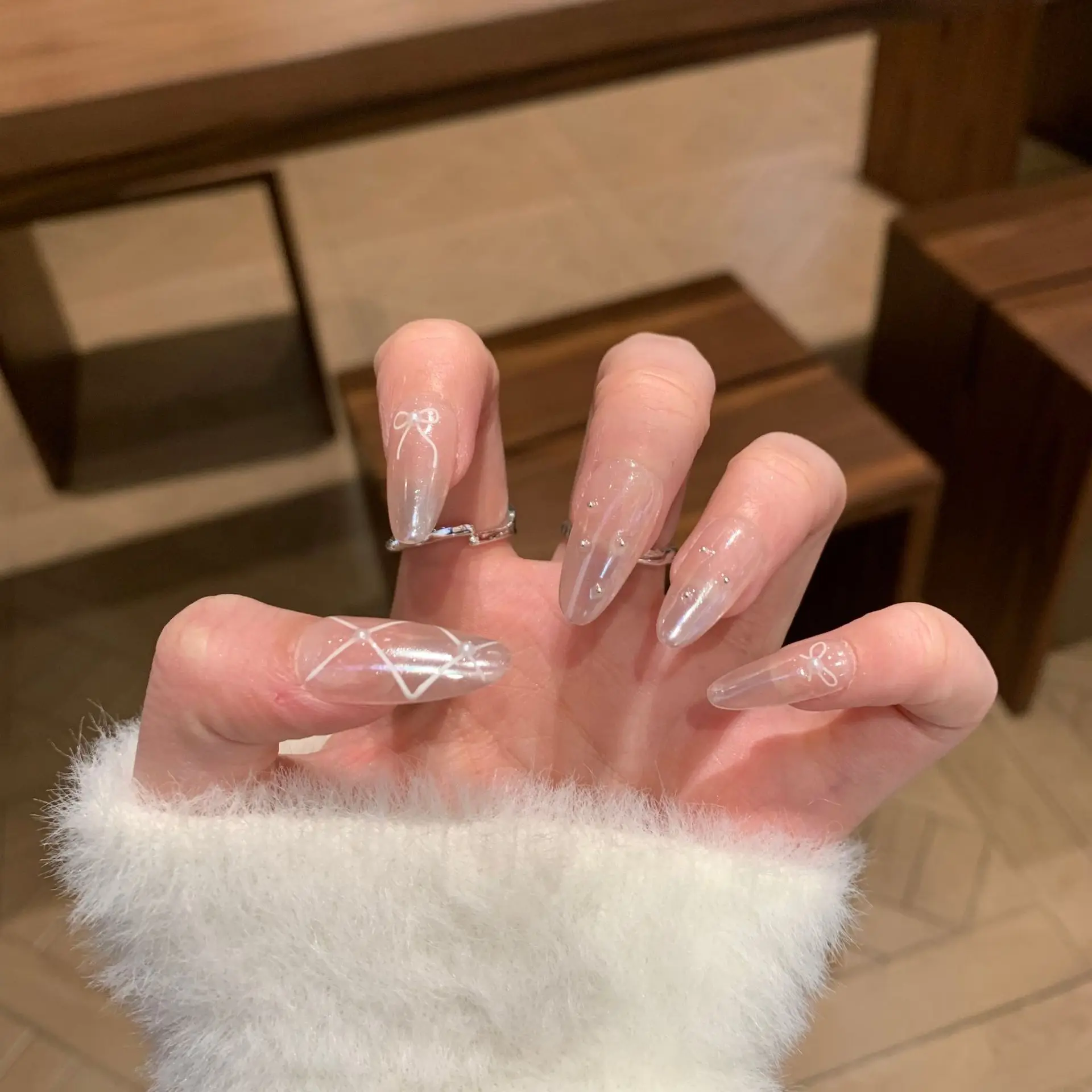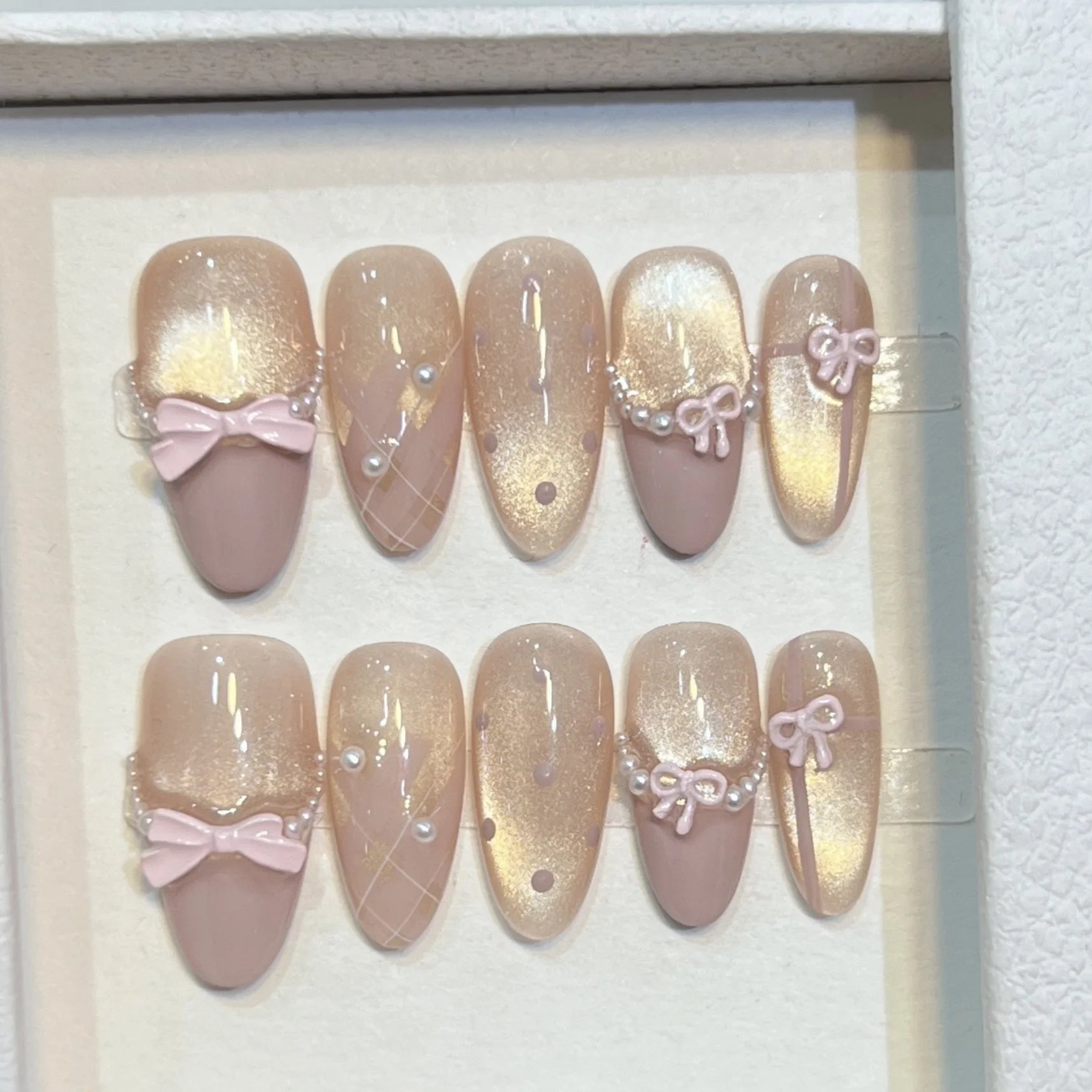 Daiiibabyyy  10pcs Purple Cat's Eye Handmade Fake Nails Tips Glitter Mid-length Oval Press on Nails Art Bow Rhinestone Design False Nail Sets