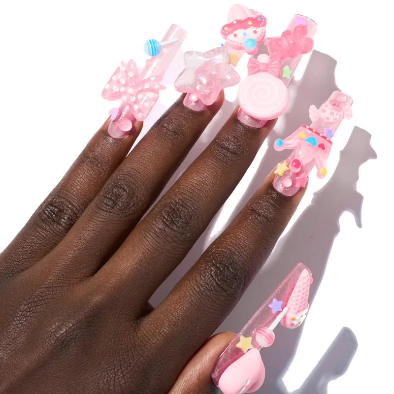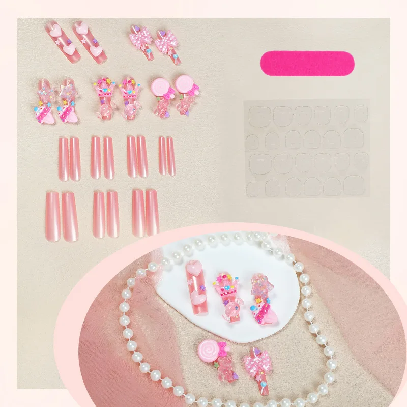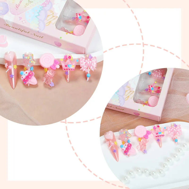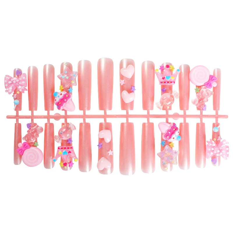 DAIIIBABYYY - 24pcs 3D Resin Candy Bow Star Decor False Nails Long Ballet Pink Press on Nails for Girls Full Cover Wearable Fake Nail Patches