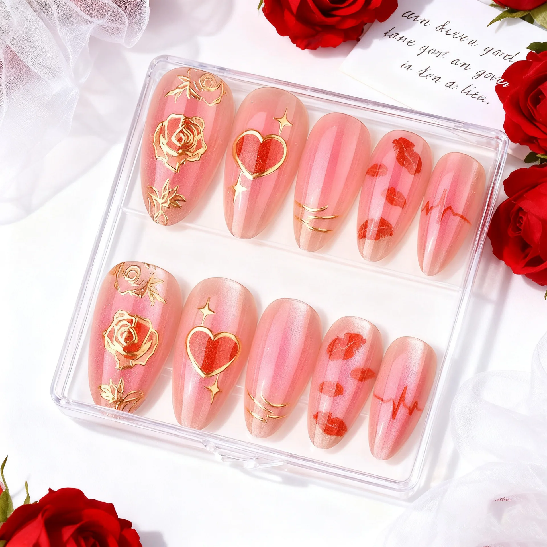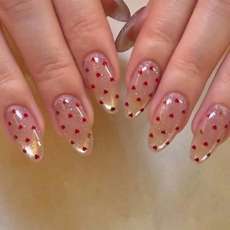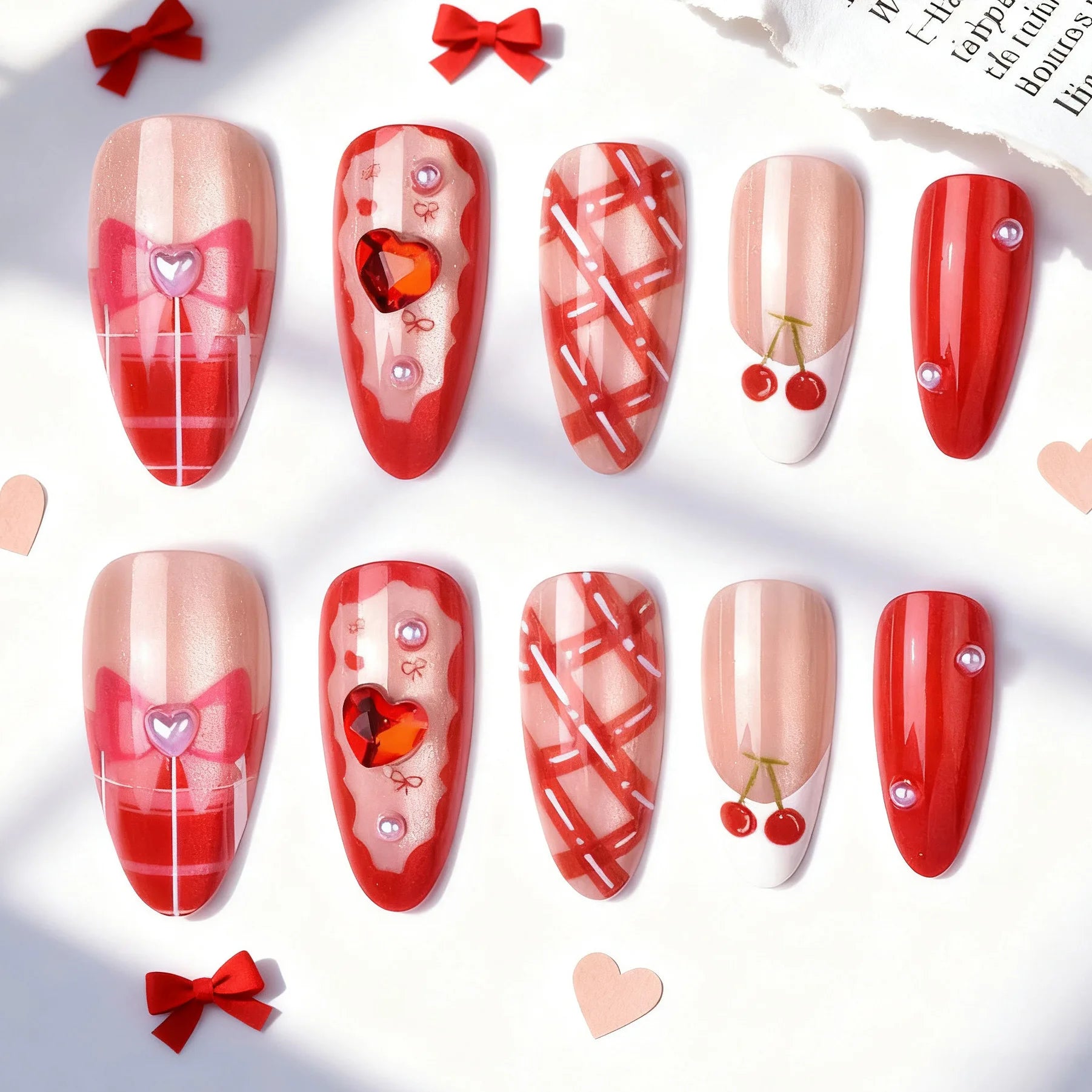 Daiiibabyyy 24Pcs Mid-length Almond Press on Fake Nails with Cat's Eye Red Heart Full Cover Nails Tips Art Detachable Artificial False Nails