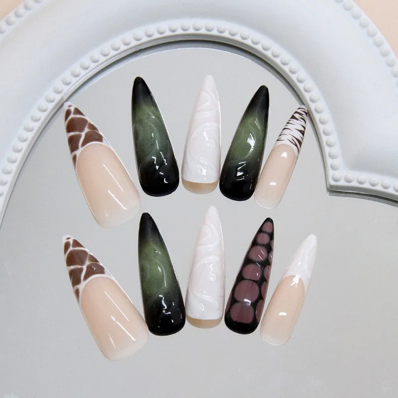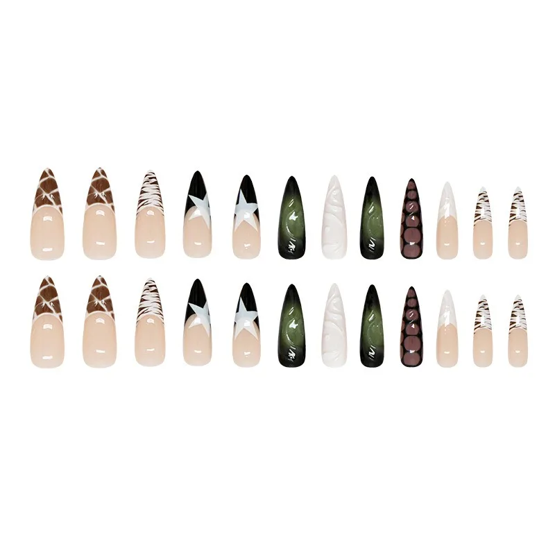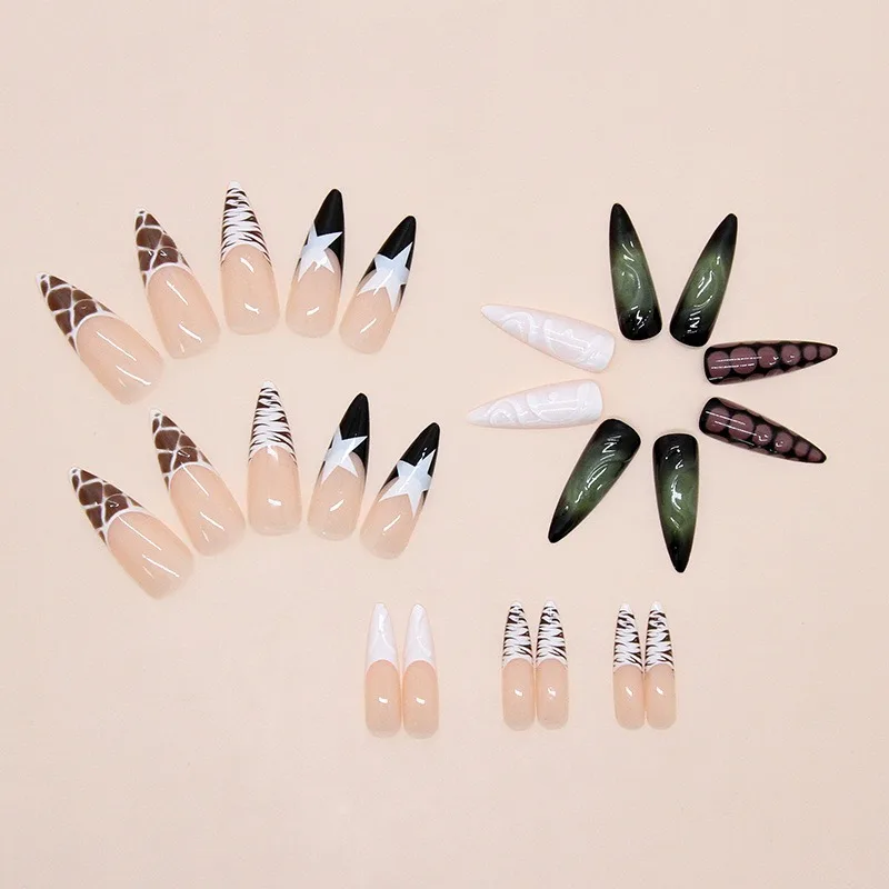 Daiiibabyyy 24PCS Sweet Cool Long Stiletto Fake Nails with Glue Zebra Stripes Star Patterns French Press on False Nails Full Cover Wearable