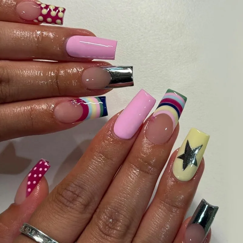 Daiiibabyyy 24PCS Y2k Colorful Medium Square Press on Nail Dopamine Graffiti French False Nails Sweet Cool Silver Star Pink Fake Nails Patch