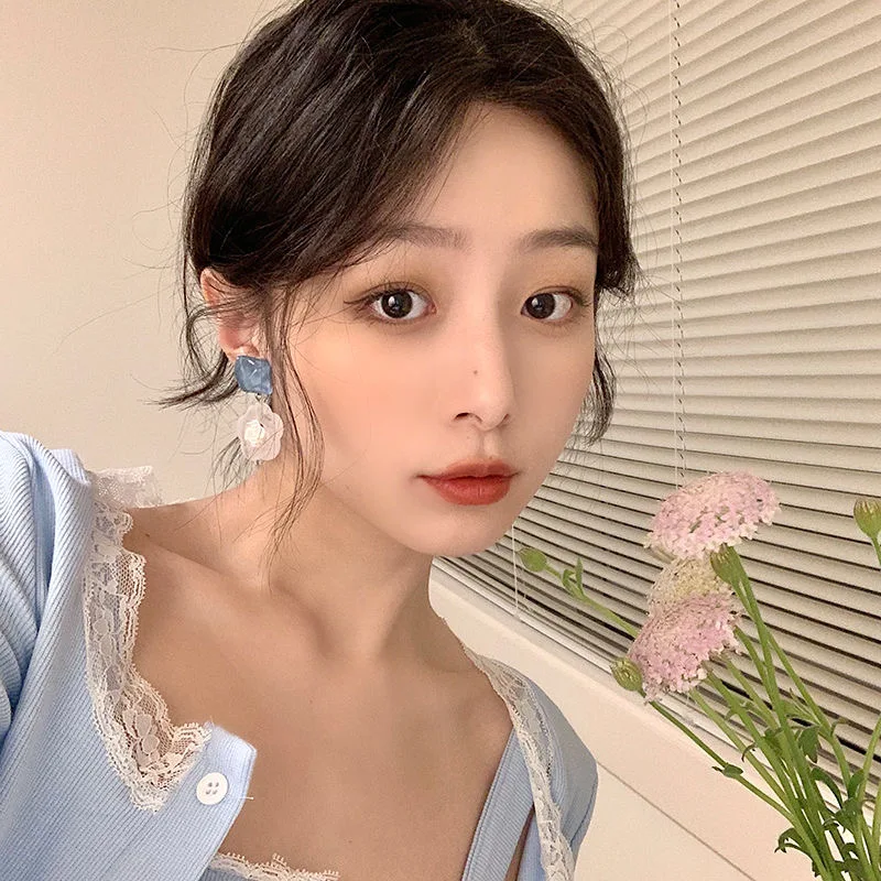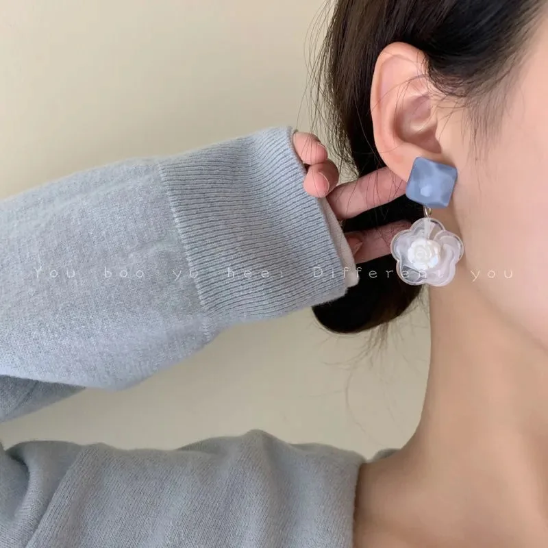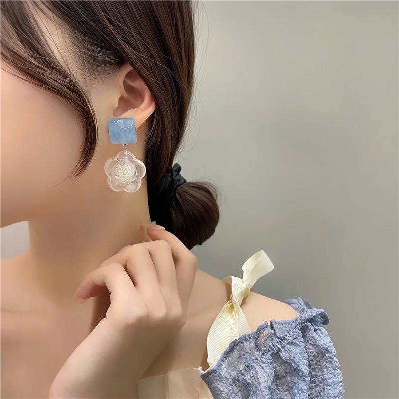 Daiiibabyyy - Sea Blue White Acrylic Drop Earrings for Women Korean Sweet Flower Statement Resin Acrylic Dangle Earrings Party Jewelry